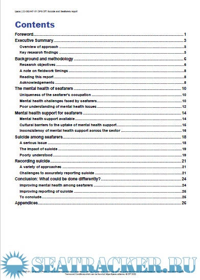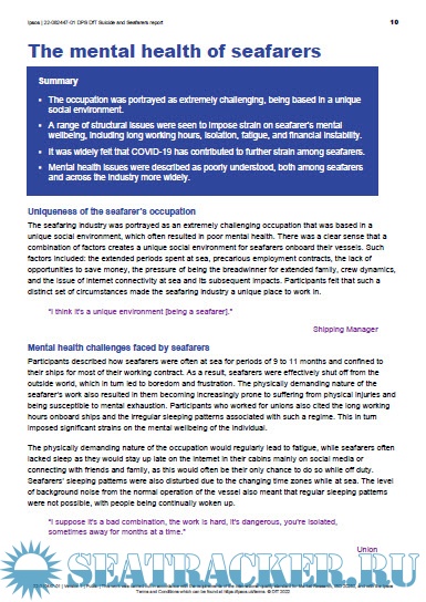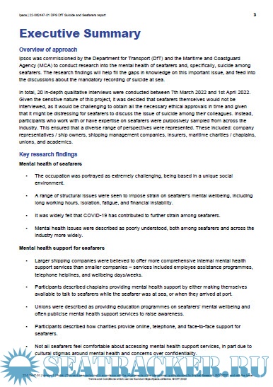 Additional info: Ipsos was commissioned by the Department for Transport (DfT) and the Maritime and Coastguard Agency (MCA) to conduct research into the mental health of seafarers and, specifically, suicide among seafarers. The research findings will help fill the gaps in knowledge on this important issue, and feed into the discussions about the mandatory recording of suicide at sea.
