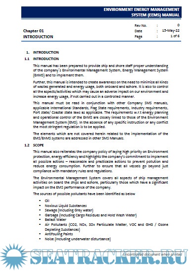 Description: This manual has been prepared to provide ship and shore staff proper understanding of the company`s Environmental Management System, Energy Management System (EnMS) and to implement them.