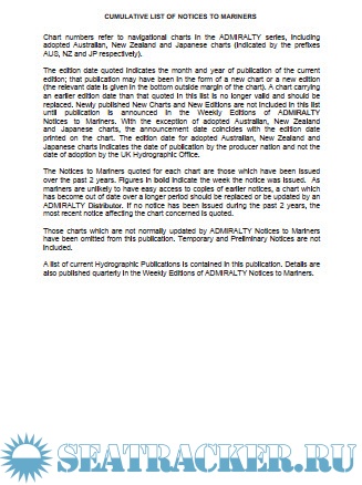 Year: 2022 Language: english Author: UKHO Publisher: United Kingdom Hydrographic Office (UKHO) Format: PDF Quality: eBook Pages count: 67 Description: The Cumulative List of ADMIRALTY Notices to Mariners (NP234 A) can help you to identify outstanding NMs and audit trails for a particular chart or charts. The list is published annually, with Part A in January and Part B in June.