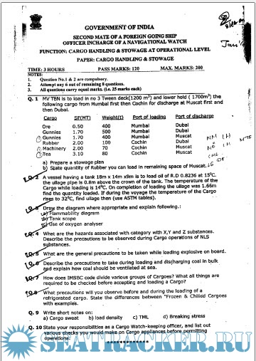 Question Paper Set for Cargo Handling and Stowage (August 2022) for Second Mate (F.G.) Mercantile Marine Department (MMD), India Examinations