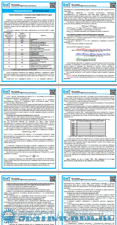 Описание: Информационный бюллетень консалтинговой компании RMT Consulting по вопросам обеспечения энергоэффективности судов в соответствии с требованиями Приложения VI МАРОЛ 73/78, которые вступают в силу 01.11.2022 г. Эти поправки предполагают необходимость определения индекса энергоэффективности существующих судов (EEXI) и индикатора углеродной интенсивности (CII), а также разработку Части III Плана управления энергоэффективностью судов (ПУЭЭС). Соответствие этим требованиям будет определяться с 01.01.2023 г.