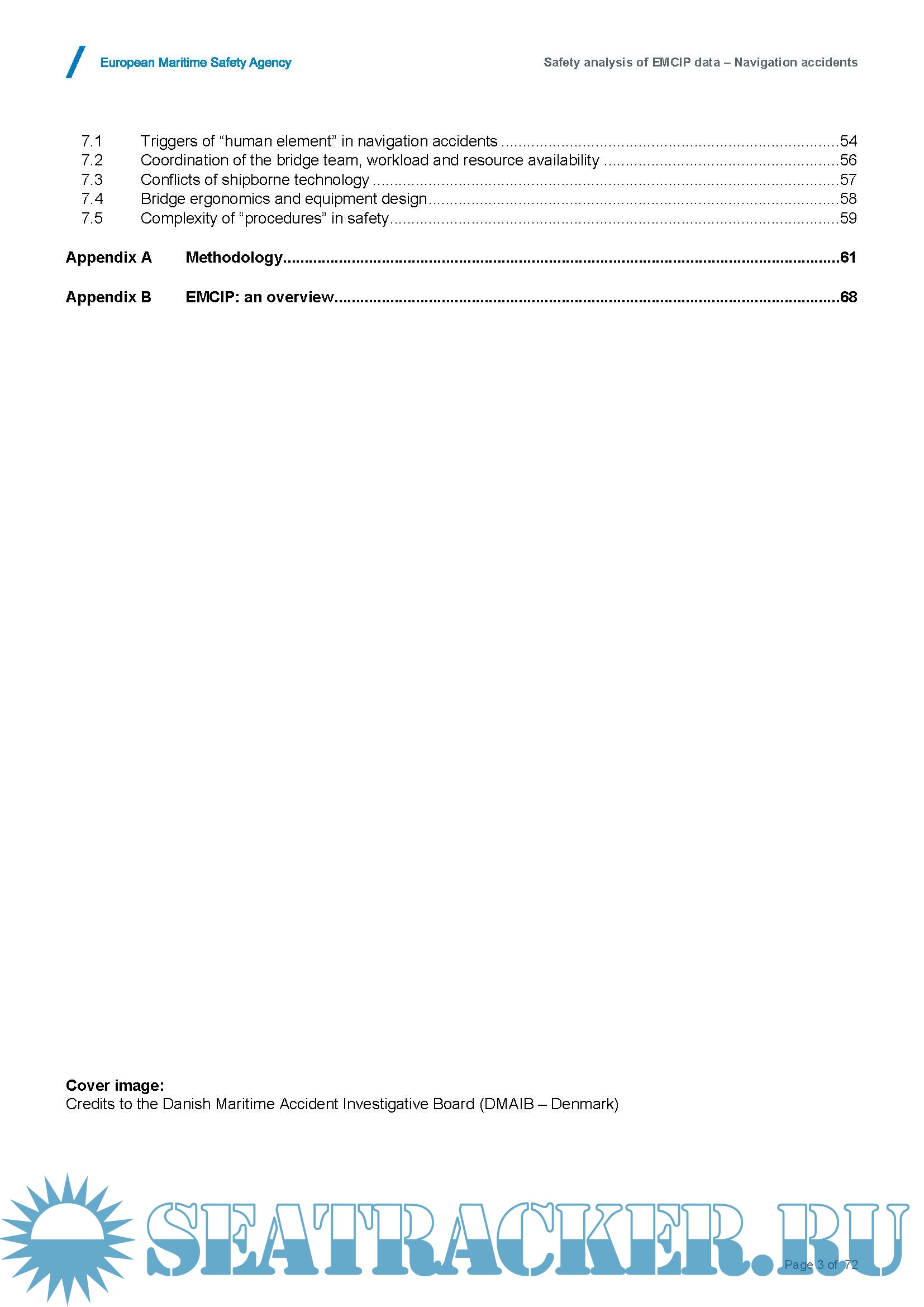 Description: This safety analysis of the European Marine Casualty Information Platform (EMCIP) data focuses on navigation accidents (i.e. collisions, groundings and contacts), given their visibility and relevance in the context of maritime safety. In particular, a significant amount of occurrences involving navigation accidents have been reported in EMCIP, covering around 28% of the overall dataset. The EMSA methodology has been applied to detect potential safety issues reported in the system, focusing on the “human element”. The analysis considered different types of vessels such as passenger ships, cargo ships and service ships.