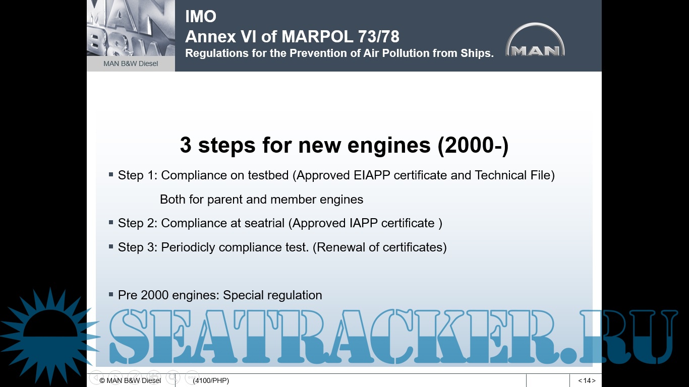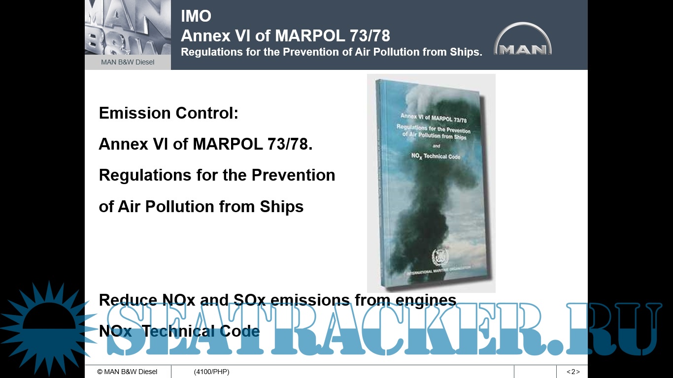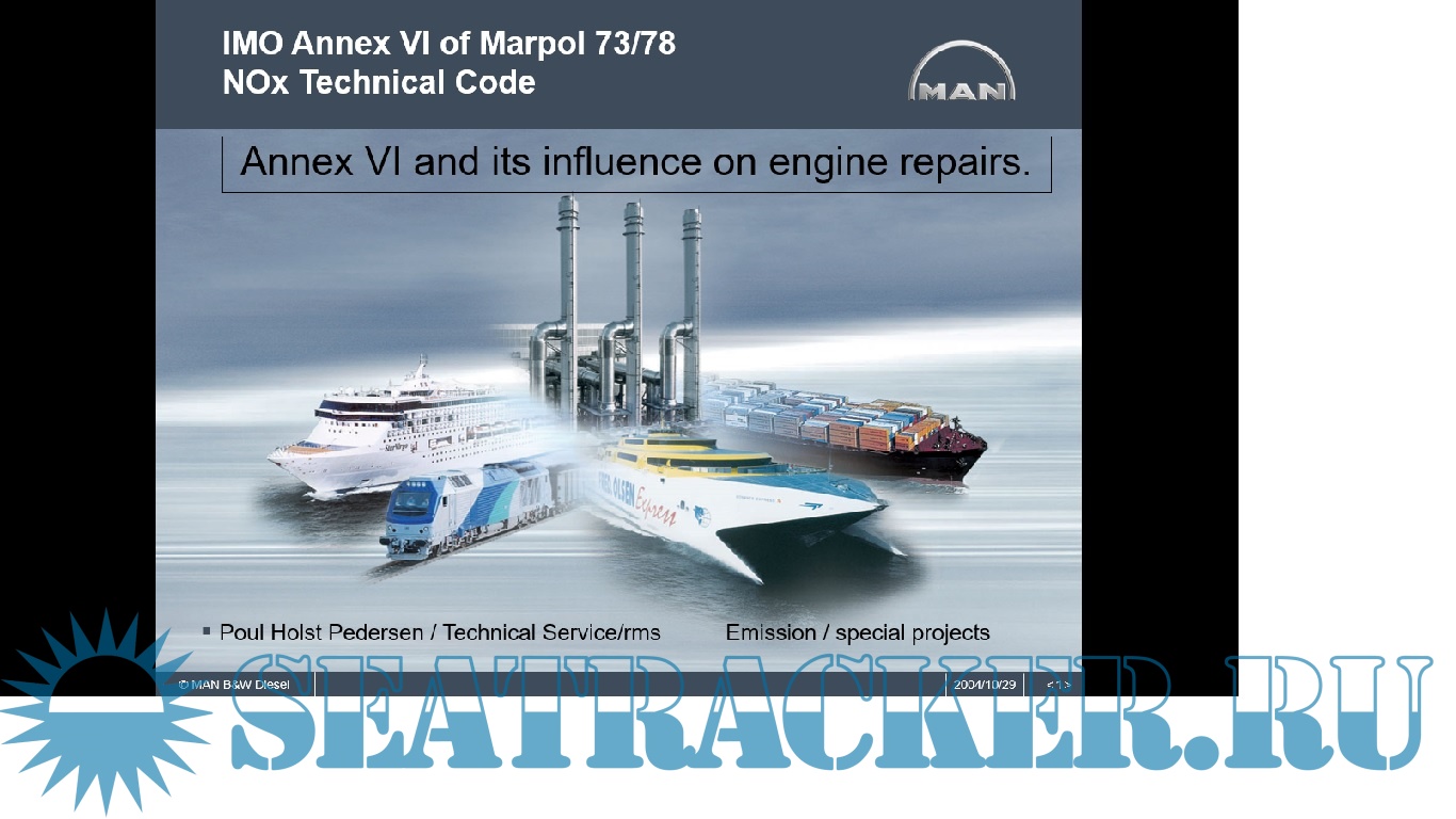Year: 2004 Language: english Author: MAN B&W Genre: Guide Format: PPT Quality: Photo of pages Pages count: 74 Description: IMO Annex VI of Marpol 73/78 - NOx Technical Code : Annex VI and its influence on engine repairs - MAN B&W Emission Control: Annex VI of MARPOL 73/78. Regulations for the Prevention of Air Pollution from Ships Reduce NOx and SOx emissions from engines NOx Technical Code
