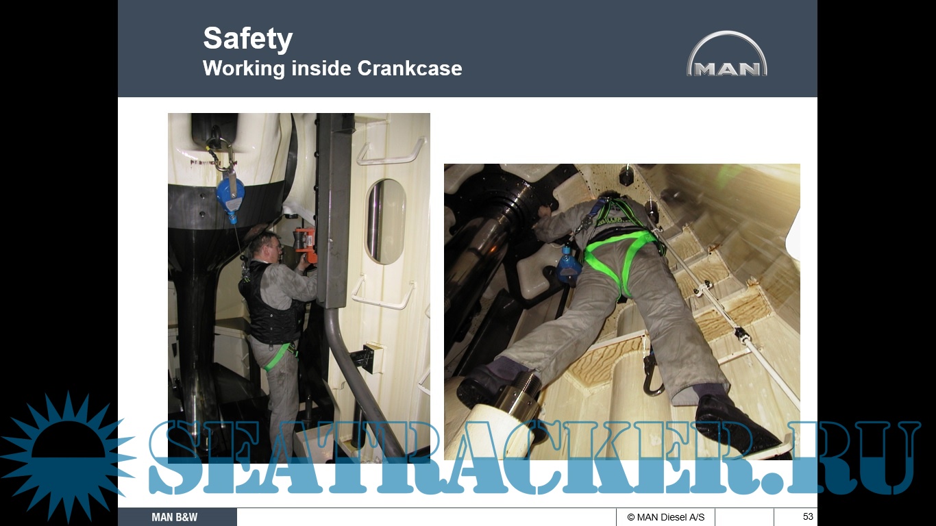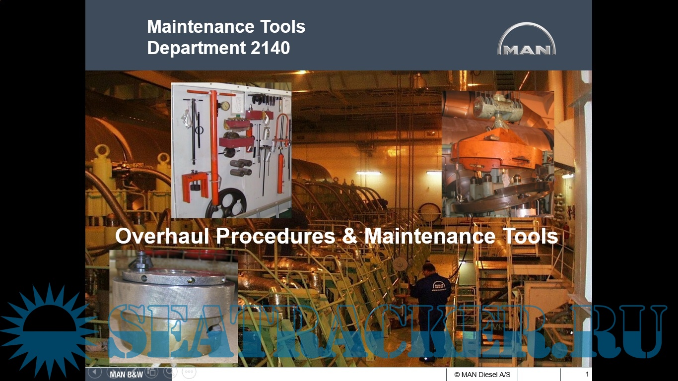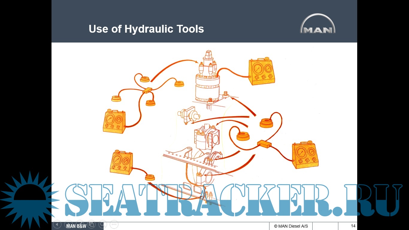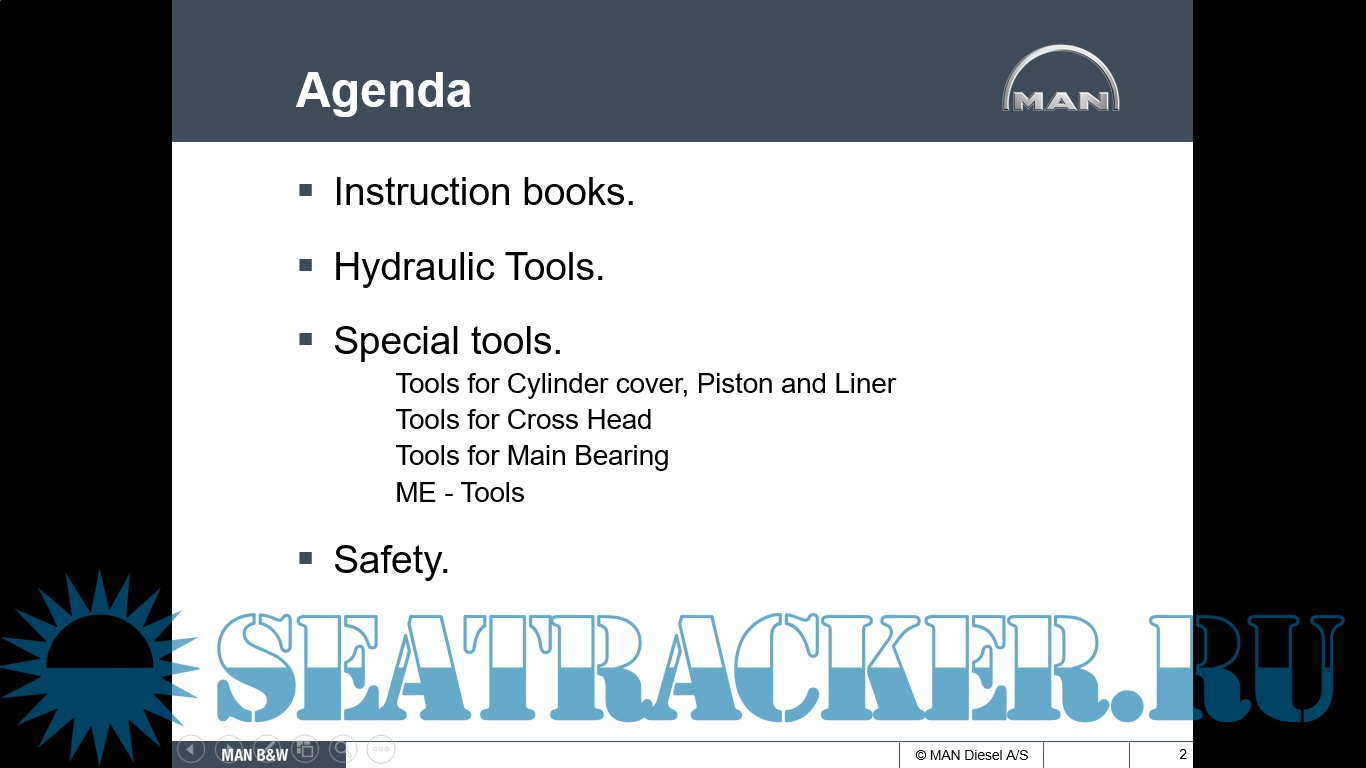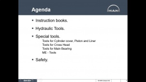 Year: 2007 Language: english Author: MAN B&W Format: PPT Quality: Photo of pages Pages count: 60 Description: Instruction books Mention Hydraulic Tools. Special tools. Tools for Cylinder cover, Piston and Liner Tools for Cross Head Tools for Main Bearing ME - Tools Safety.