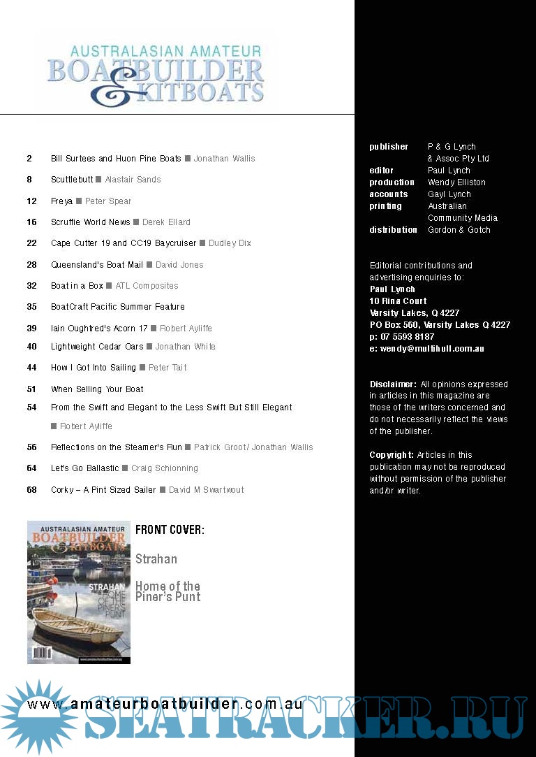 Description: : Australialian Amateur Boat Builder Magazine is an Australian-based specialist publication devoted exclusively to Amateur Boat Building enthusiasts