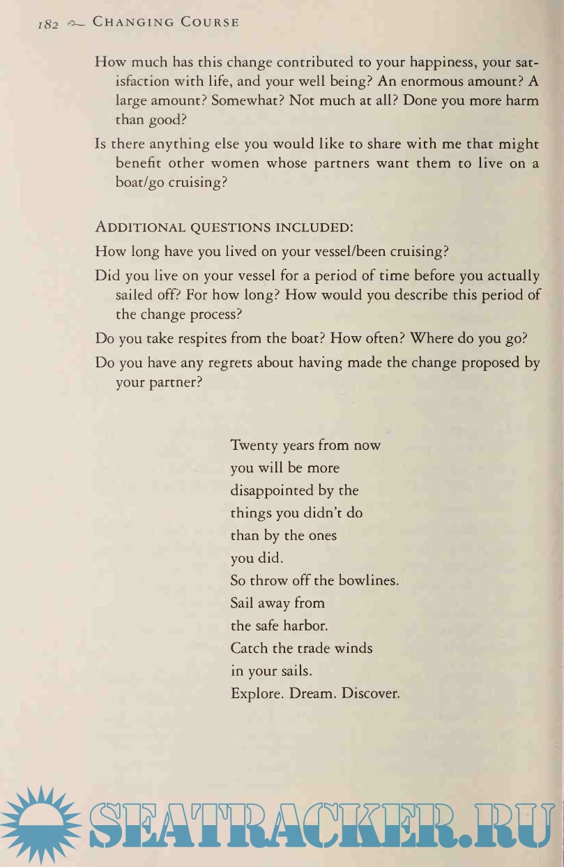 Year: 2001 Language: english Author: Debra Cantrell Genre: Guide Publisher: International Marine Publishing Edition: First ISBN: 978-0071427890 Format: PDF & EPUB Quality: Scanned pages Pages count: 195 Description: When her husband proposed living on a boat full-time, Debra Cantrell wondered what other women in her position had done and began a five-year study to find out what choices they had made and how it had all worked out. The result is Changing Course, a guidebook for navigating this odyssey. No matter what the outcome, each woman was strengthened by the experience. In an era when "downshifting" is common and people are considering the benefits of simplified living, Changing Course is both timely and practical. "The essential first step for all couples planning to sail away; this is a must-read."--Paul and Sheryl Shard, authors of "Sail Away!" ""Changing Course" is the first book that honestly evaluates the transition to life afloat."--Beth Leonard, author of "The Voyager's Handbook" Debra Ann Cantrell faced a dilemma when her husband proposed living and cruising on a boat. She would lose a career she loved and, she feared, everything by which she'd defined herself. She wondered how others had made the decision to go cruising and how their choice affected their lives. Her search for answers led her to more than a hundred women, over a five-year period, whose partners had proposed the cruising life. "Changing Course" chronicles the odyssey of making a major lifestyle change from land to sea. This thought-provoking and highly personal book explores what women stand to gain when they set forth on such a journey--and what they stand to lose if they do not. Additional info: Debra Cantrell is an adult educator working with the native peoples of Canada--helping them develop self-government and social institutions. A large part of her job is facilitating workshops; she also trains counselors to deal with social problems such as alcoholism and child abuse. Her husband first started talking about longterm cruising in 1987, and they chartered in the Caribbean in 1987, 1991, and 1993. They bought their boat while on charter in 1993, and have since been easing into the cruising life with two-month cruises whenever possible. They made their first major offshore passage (U.S. Virgins to the Chesapeake) in 1997. Meanwhile, in her doctoral program in Adult Education, Cantrell wrote her dissertation on women embracing the cruising lifestyle. Through the internet and sailing magazines, she met and interviewed 107 women, following some 80 of them over a five-year period of their lives. Cantrell sees a conjunction between her professional work and her interest in cruising women--in both areas she has focused on holistic wellness, health and happiness achieved through challenge and change.
