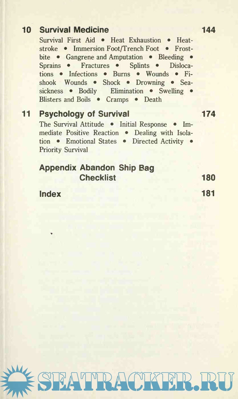 Description: Discusses essential preparations and equipment for use in the event of boating accidents, and teaches shipwreck and liferaft survival skills