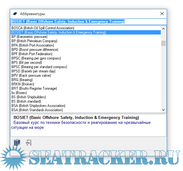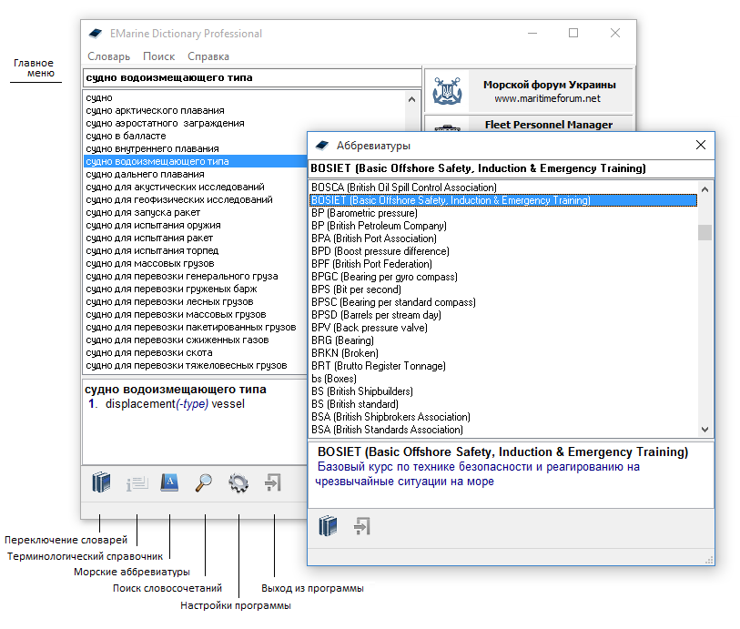 Данная версия электронного словаря содержит англо-русскую и русско-английскую морскую терминологию, наиболее часто встречаемые сокращения, используемые в морской практике, судостроении, морской технике и радиосвязи. Собраны справочные (энциклопедические) материалы освещающие основные морские термины, некоторые из которых сопровождаются соответствующими иллюстрациями.