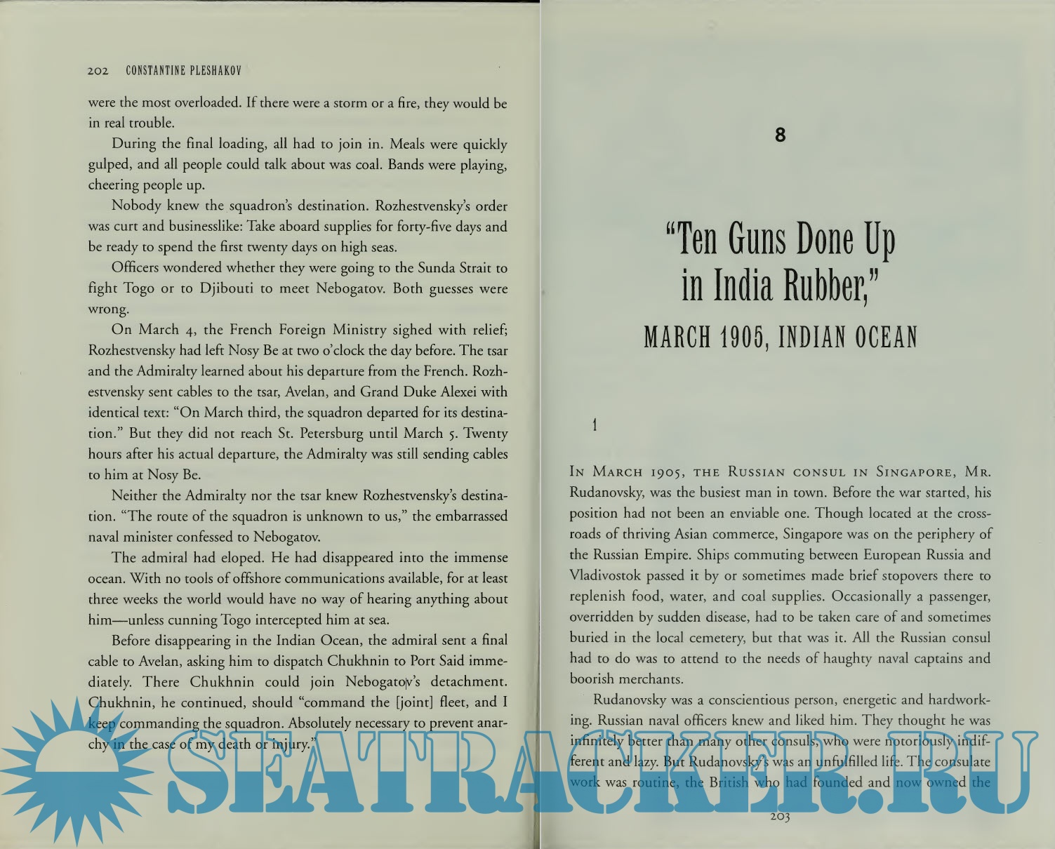 Description: On May 14-15, 1905, in the Tsushima Straits near Japan, an entire Russian fleet was annihilated, its ships sunk, scattered, or captured by the Japanese. In the deciding battle of the Russo-Japanese War, the Japanese lost only three destroyers but the Russians lost twenty-two ships and thousands of sailors. It was the first modern naval battle, employing all the new technology of destruction. The old imperial navy was woefully unprepared. The defeat at Tsushima was the last and greatest of many indignities suffered by the Russian fleet, which had traveled halfway around the world to reach the battle, dogged every mile by bad luck and misadventure. Their legendary admiral, dubbed "Mad Dog," led them on an extraordinary eighteen-thousand-mile journey from the Baltic Sea, around Europe, Africa, and Asia, to the Sea of Japan. They were burdened by the Tsar's incompetent leadership and the old, slow ships that he insisted be included to bulk up the fleet. Moreover, they were under constant fear of attack, and there were no friendly ports to supply coal, food, and fresh water. The level of self-sufficiency attained by this navy was not seen again until the Second World War. The battle of Tsushima is among the top five naval battles in history, equal in scope and drama to those of Lepanto, Trafalgar, Jutland, and Midway, yet despite its importance it has been long neglected in the West. With a novelist's eye and a historian's authority, Constantine Pleshakov tells of the Russian squadron's long, difficult journey and fast, horrible defeat.