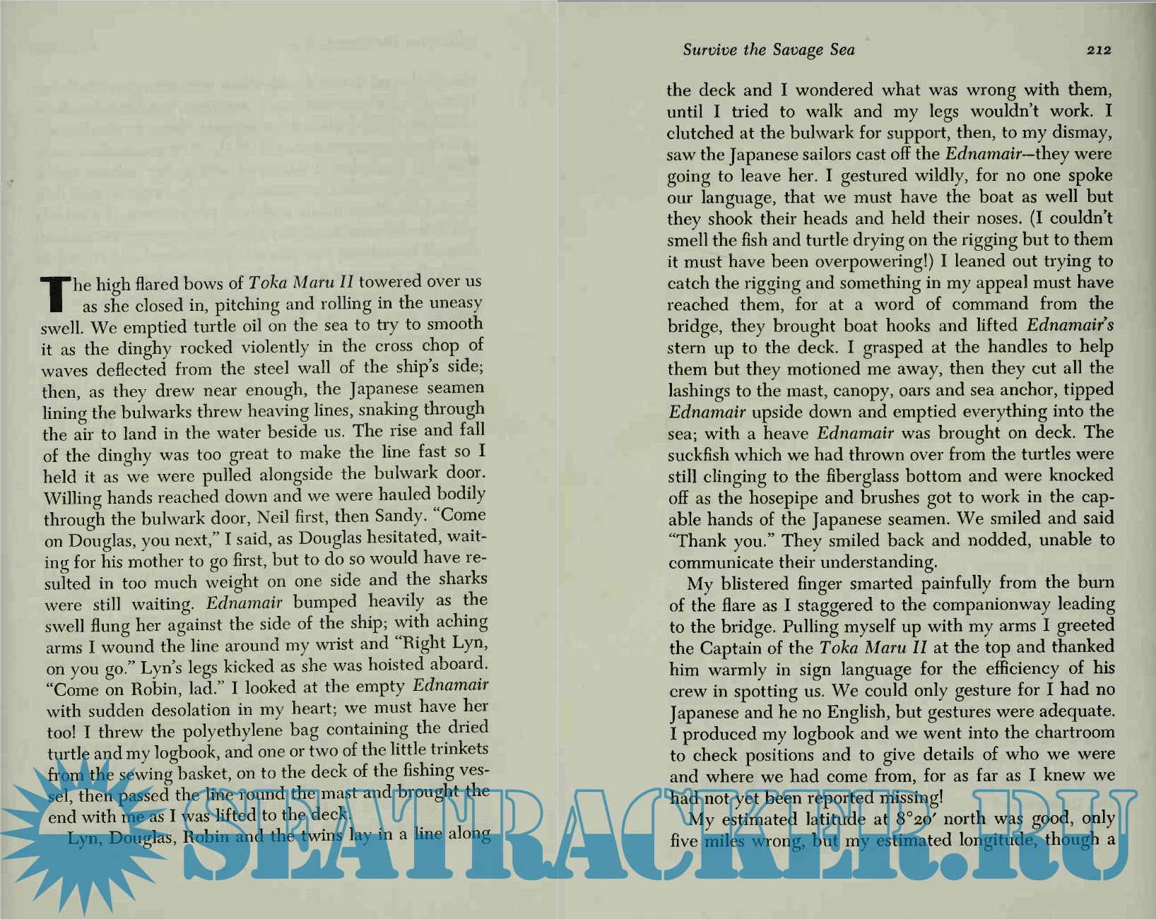 For 37 days—using every technique of survival—they battled against 20-foot waves, marauding sharks, thirst, starvation, and exhaustion, adrift in the vast reaches of the Pacific before their ordeal was ended by a Japanese fishing boat. The Robertsons' strong determination shines through the pages of this extraordinary book which describes movingly their daily hopes and fears, crises and triumphs, tensions and heartbreaks.