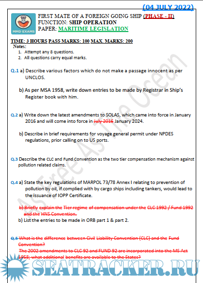 Question Paper Set for Maritime Legislation (July 2022) Phase II (Chief Mate F.G.) Mercantile…