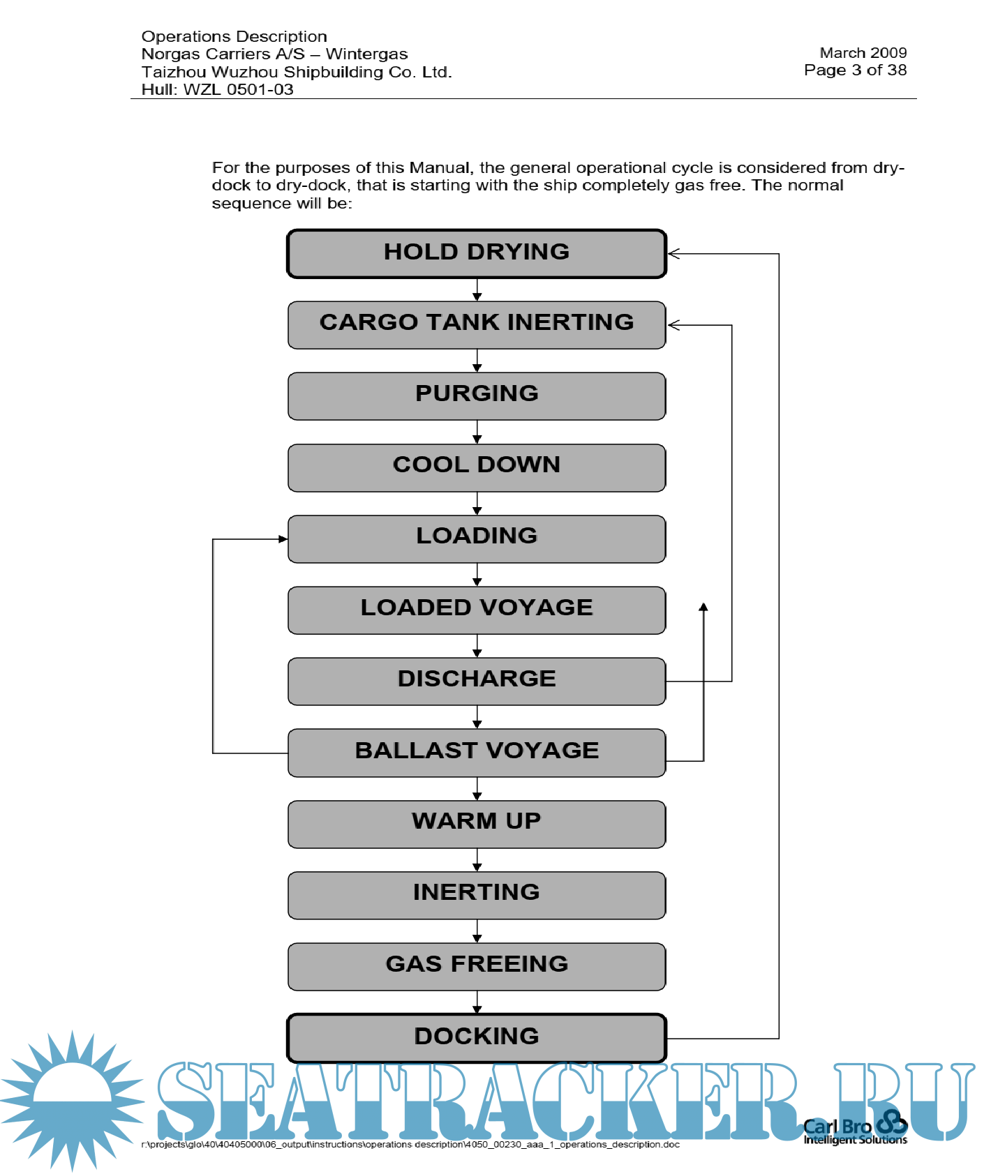 Year: 2009 Language: english Author: Carl Bro Intelligent Solutions Genre: Manual Format: PDF Quality: eBook Pages count: 38 Description: All cargo operations must be conducted in accordance with the procedures described in this Manual and Owner's standing instructions in respect of safety and cargo care. Industry safety standards must be observed as set out, for example, in the ICS Tanker Safety Guide and SIGTTO's "Liquefied Gas Handling Principles". It is the Master's duty to ascertain all relevant safety regulations in respect of the particular cargo to be carried and the existence of any specific local or national requirements applicable to the ship. Furthermore it is the Master's duty to ensure that the relevant Officers are fully aware of any applicable regulations and to ensure that these are observed.