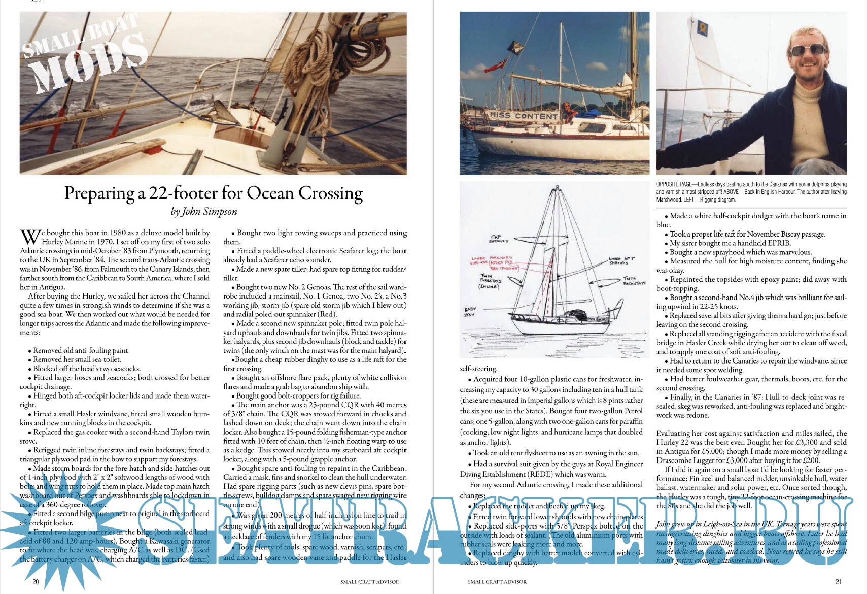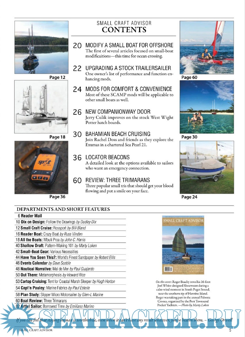 Description: Small boats, big adventure! The only magazine focused on small and trailerable sailboats, cruising, and adventure. Each issue features places to sail, how-to and modification articles, a plan study for the boat builder, and a feature-length review of a production sailboat.