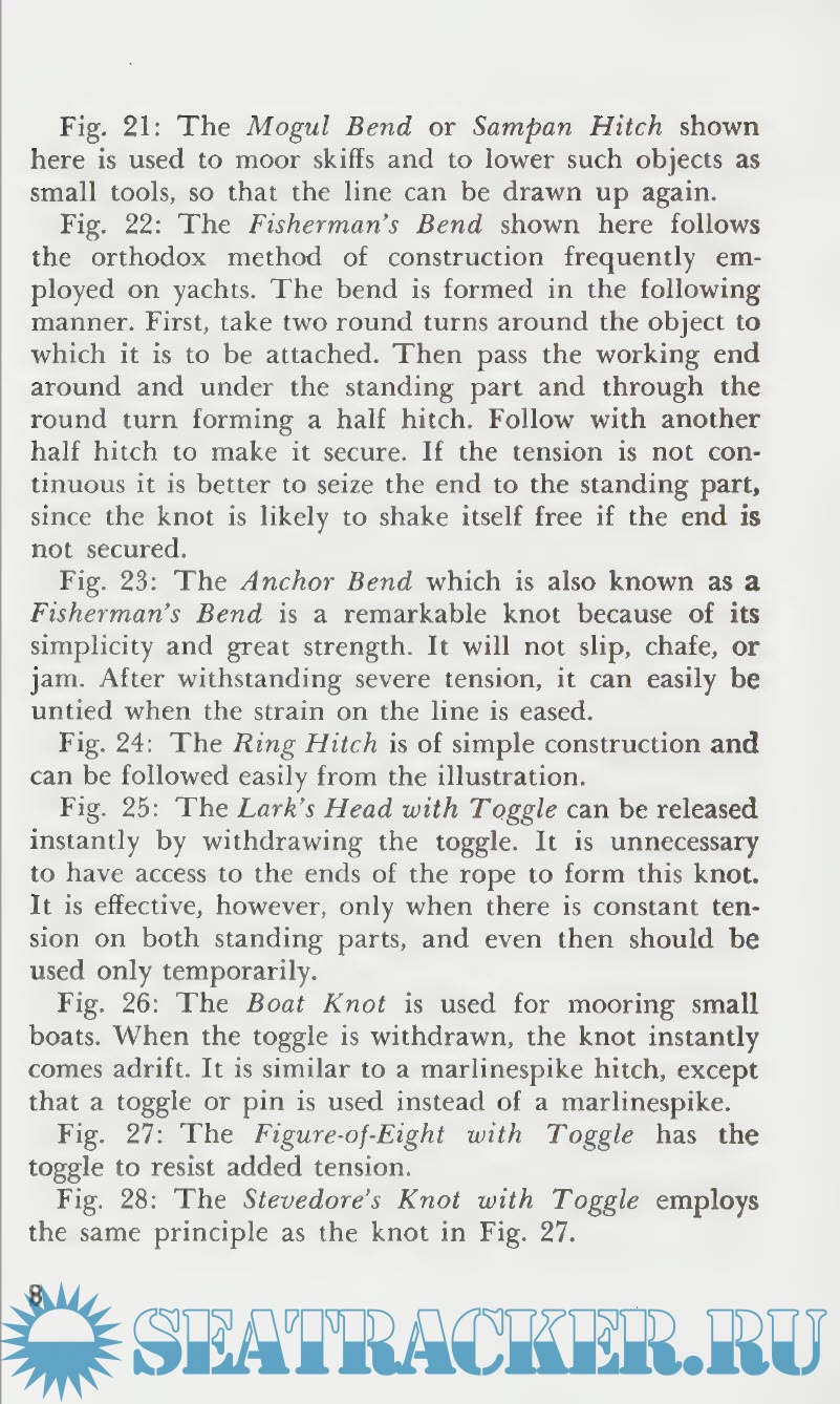 Year: 1945 Language: English Author: Raoul Graumont Genre: Handbook Publisher: Cornell Maritime Press Edition: First ISBN: 0-87033-030-6 Format: PDF Quality: Scanned pages Pages count: 210 Description: This handbook serves as a practical guide for all phases of knot techniques - both practical and decorative in purpose. Much more than a reference work, the handbook leads the interested reader to the mastery of an artistic and absorbing hobby. Common types of work knots such a hitches, sheepshanks, and bowlines are demonstrated along with good explanation of blocks and tackle. There are sections of sennet braiding, ornamental designs, lashings, securing hawsers, boatswain's chair, hammock making, and various ties which provide an excellent foundation for understanding and executing general knot work and wearing.