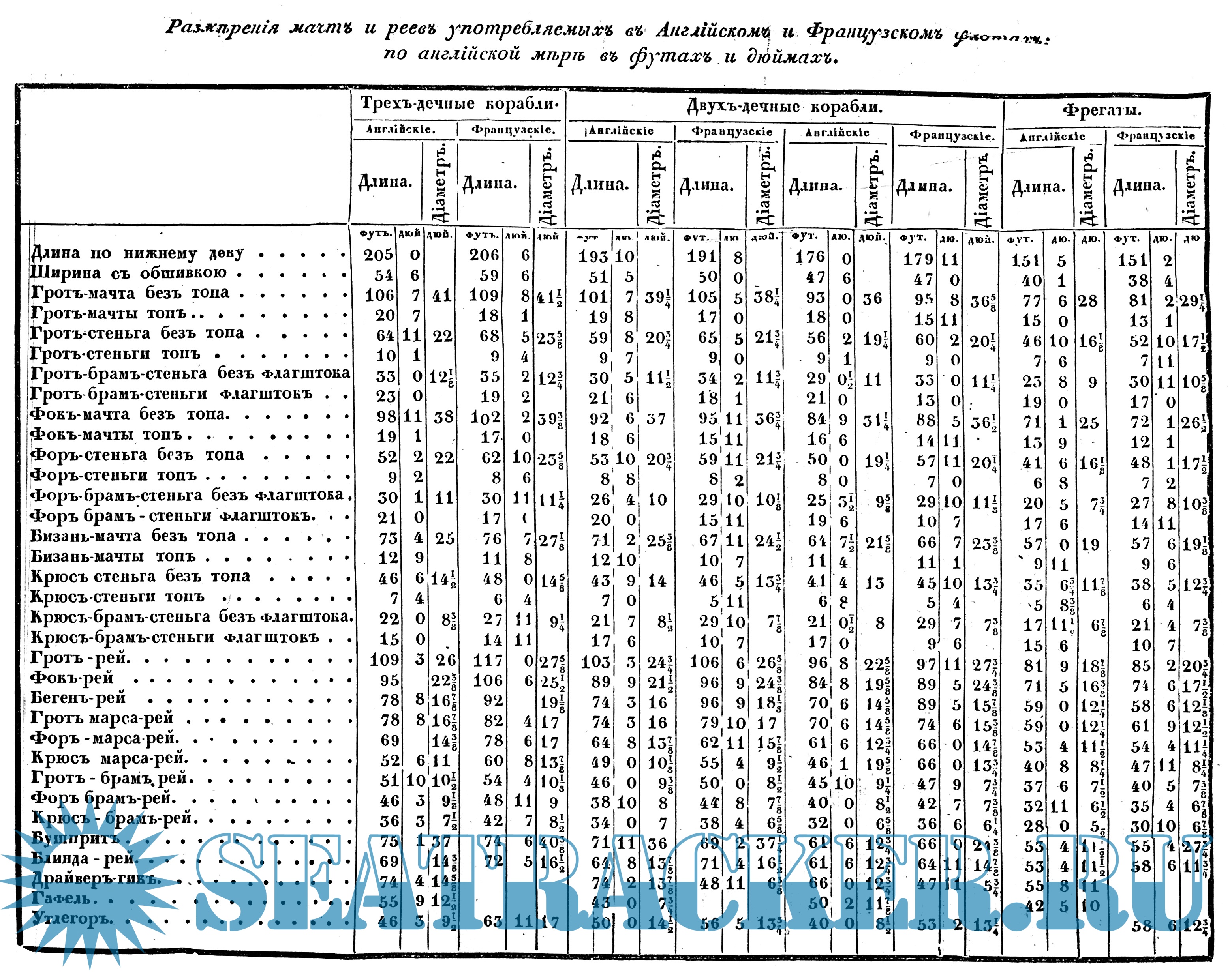 В третьем отделении показаны пропорции главных и малых диаметров мачт, реев и прочего.