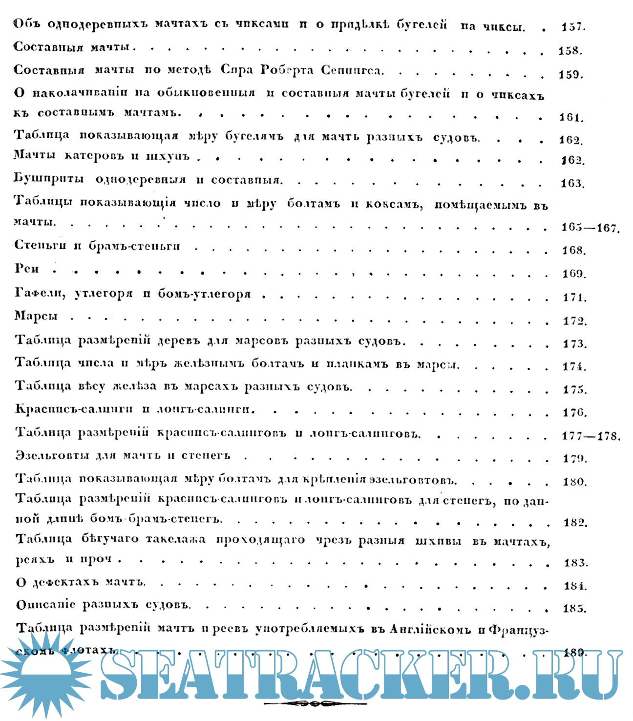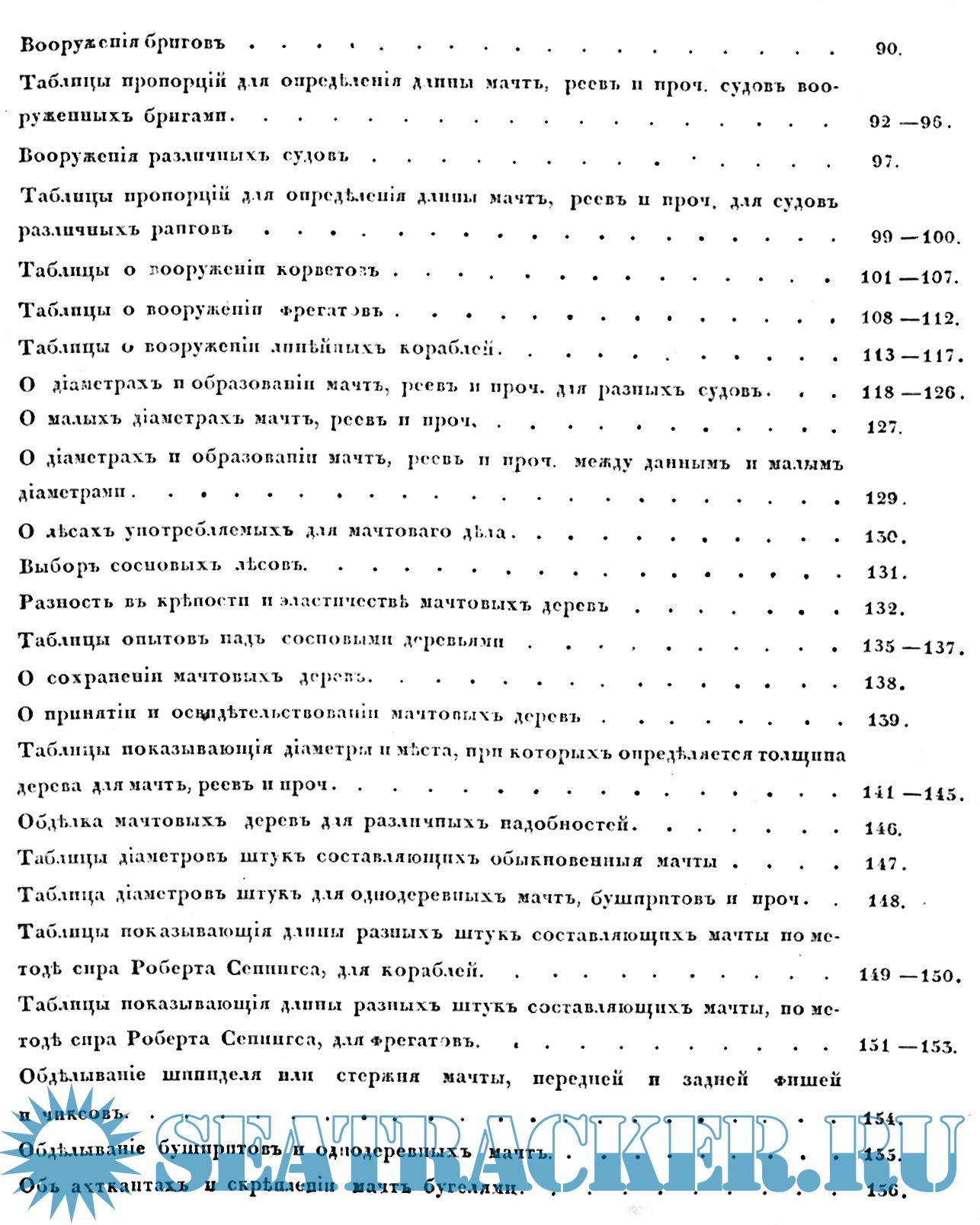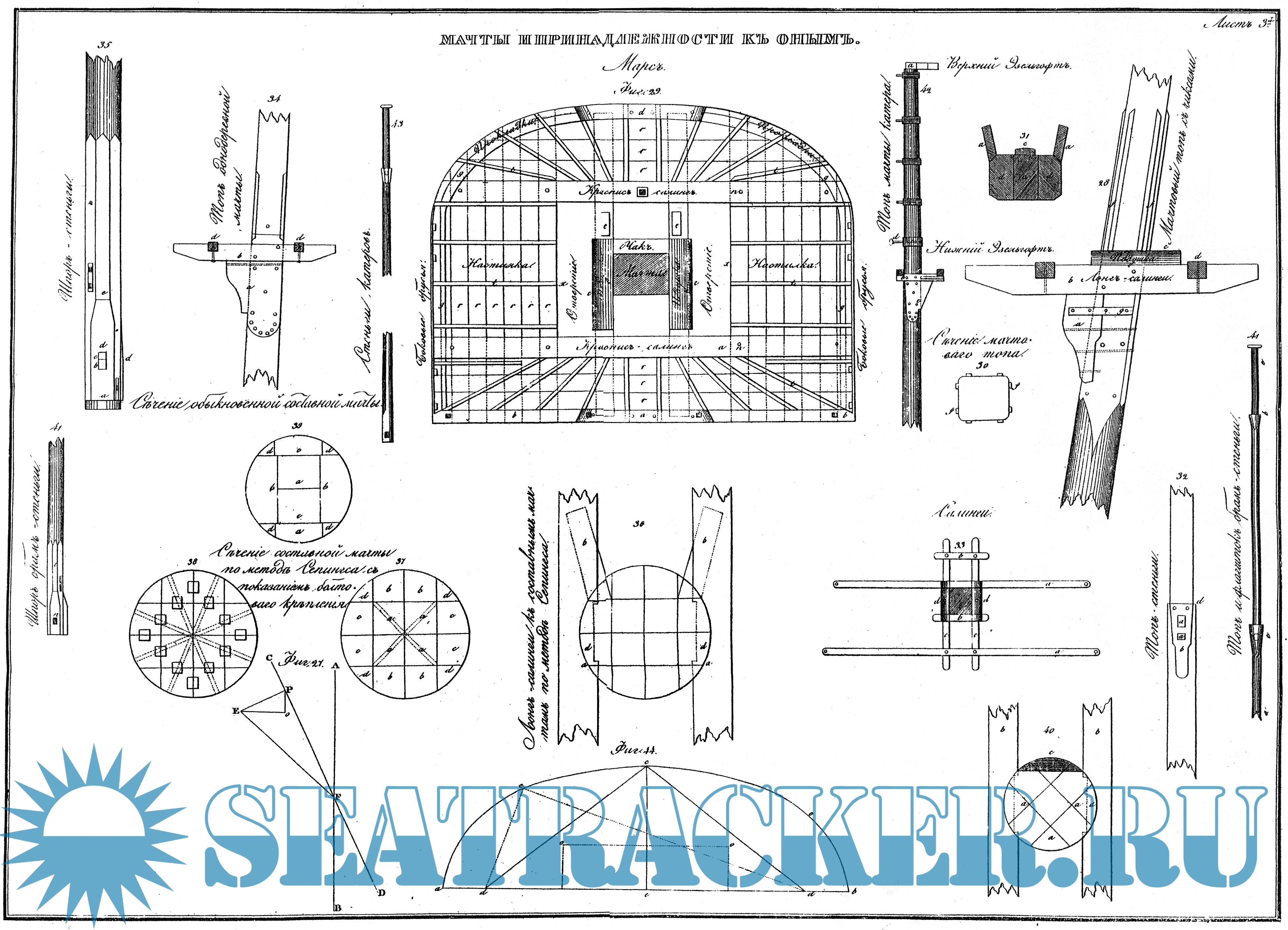 И наконец в пятом отделении объяснены разныя методы составления мачт, реев и прочего, скрепления оных и другие мелкия работы, относящиеся до мачтового дела; в конце этого отделения помещены замечания об освидетельствовании мачтовых деревьев, определения степени их годности и о делании в случае нужды временных рей и прочего в море.