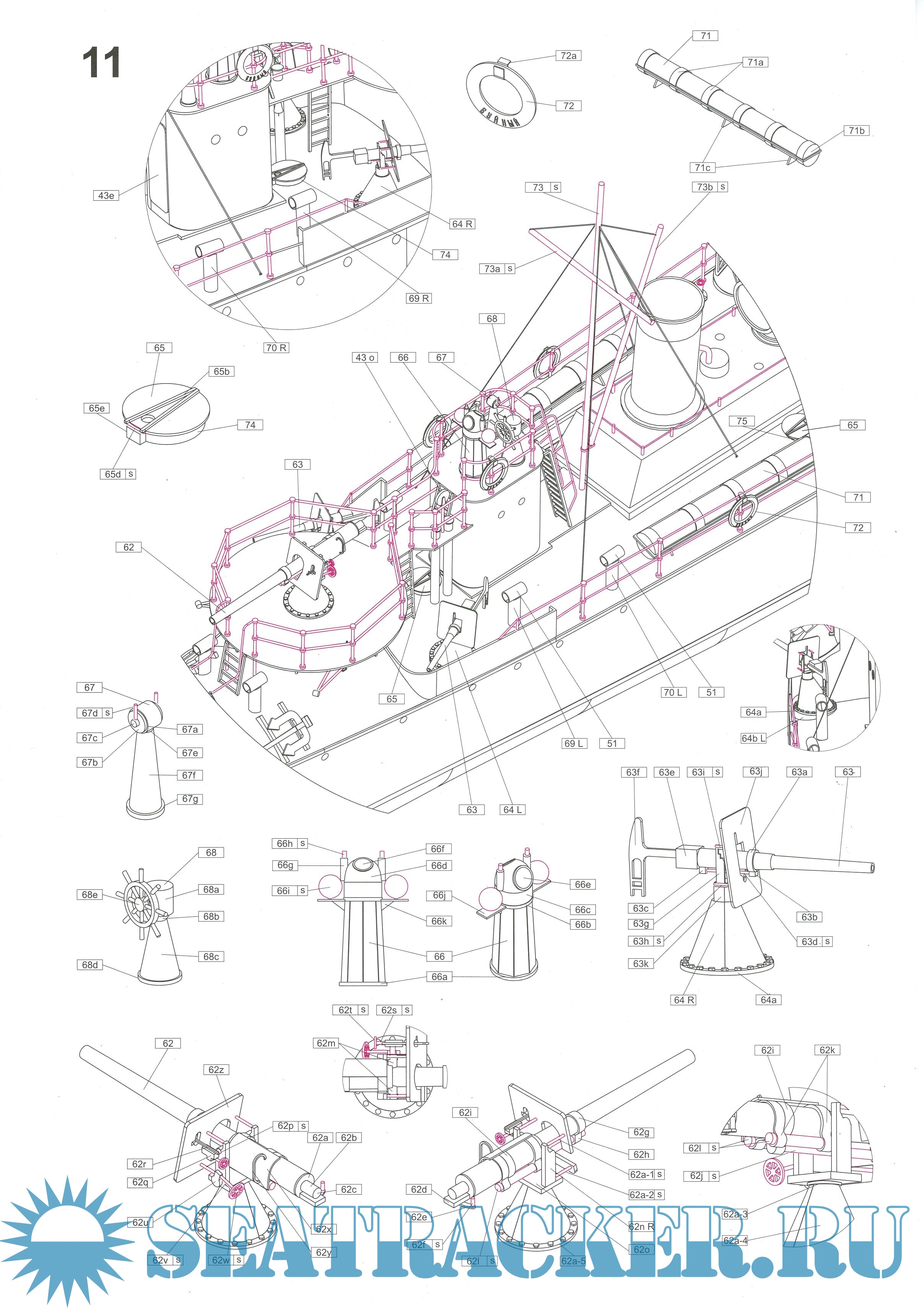 13 листов формата А4 цветных выкроек для создания модели миноносца "Буйный" по состоянию на 1902 год в масштабе 1:100. Инструкция на русском, немецком и польском языках.