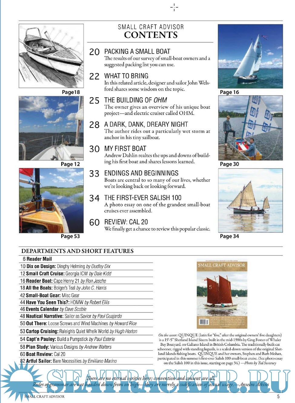 Description: Small boats, big adventure! The only magazine focused on small and trailerable sailboats, cruising, and adventure. Each issue features places to sail, how-to and modification articles, a plan study for the boat builder, and a feature-length review of a production sailboat.