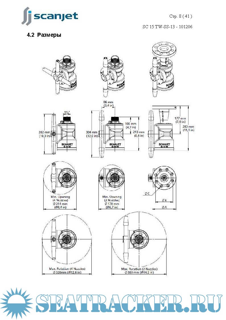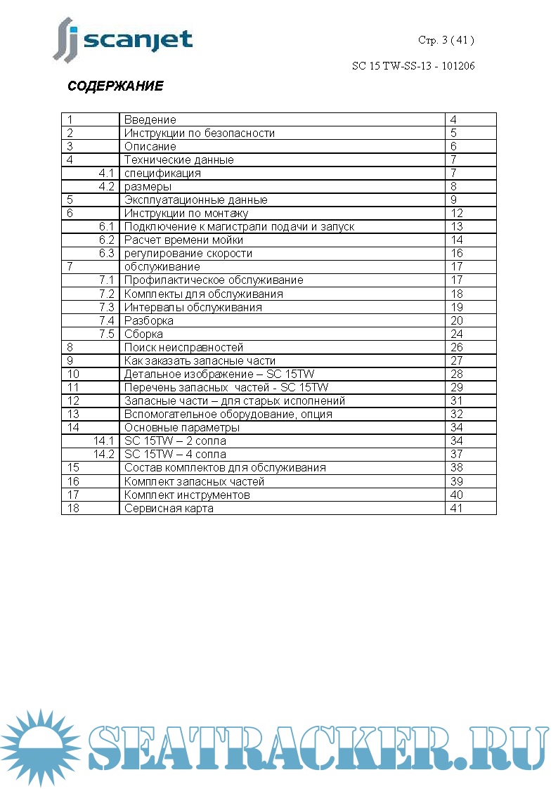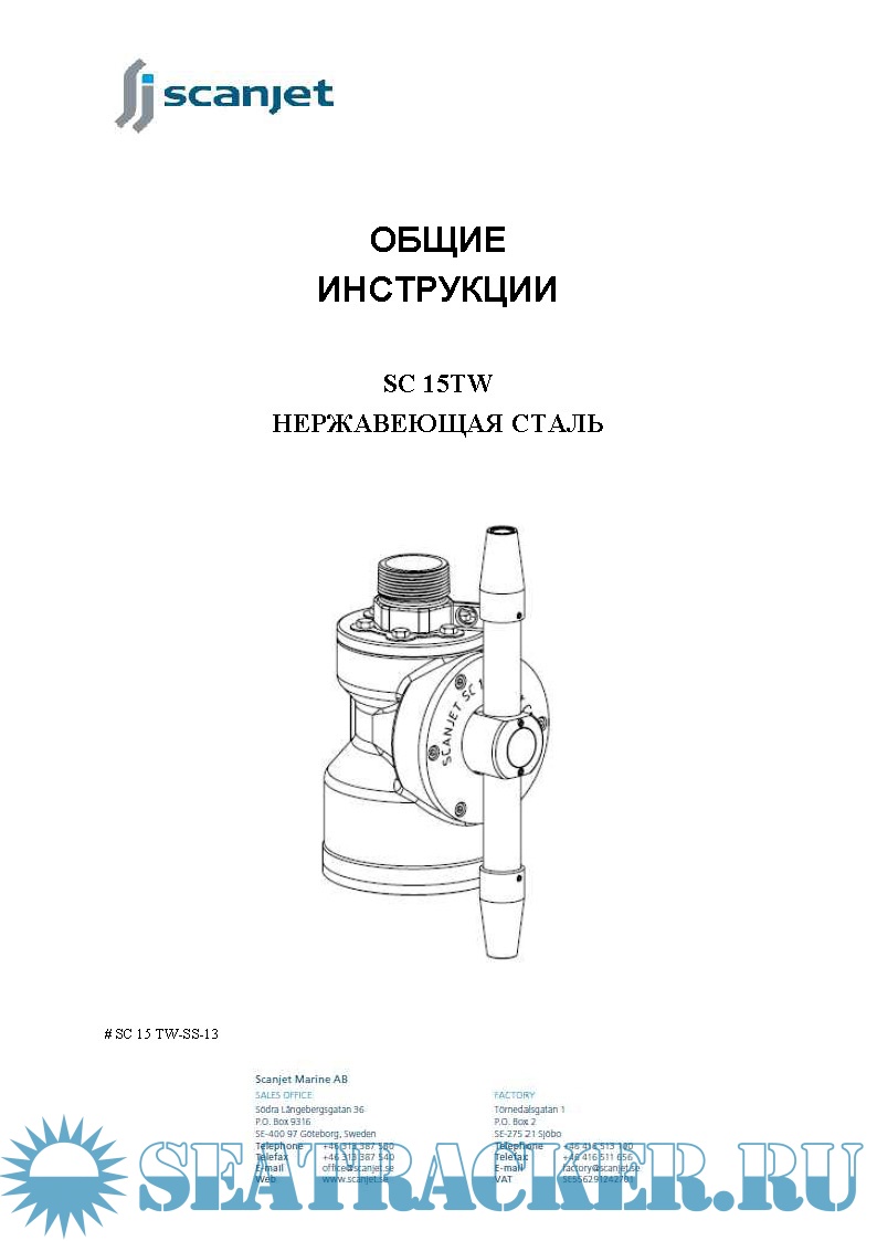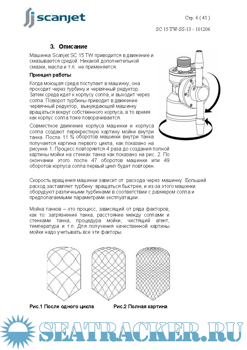 Год выпуска: 2010 Язык: русский Автор: www.scanjet.se Жанр: Инструкция Формат: PDF Качество: Изначально компьютерное (eBook) Количество страниц: 41 Описание: Машинка мойки танки SCANJET, модель SC 15TW предназначена для мойки грузовых и слоп-танков у химовозов/продуктовозов, а также других танков. Размер, конструкция и требования к мойке этих танков являются проектными данными и рассматриваются до установки машинок. Моечную машинку типа SC15 TW можно использовать как стационарную, так и как переносную. Процесс мойки начинается с открытия клапана для моющей среды. Поток воды проходит через турбину внутри машинки, и сопла будут вращаться, создавая картину мойки внутри танка. По окончании процесса мойки клапаны необходимо закрыть. Машинка SC15 TW стандартно поставляется с двумя или четырьмя соплами, размер сопла от Ø6 мм до Ø 10 мм. Данная инструкция была подготовлена для содействия персоналу, который будет эксплуатировать и обслуживать моечные машинки. Ключ для продолжительного срока службы машинки – качественное регулярное обслуживание. Машинка выполняет грубую и грязную работу для вас. Качественный уход за машинками SC15 TW продлит срок их службы.