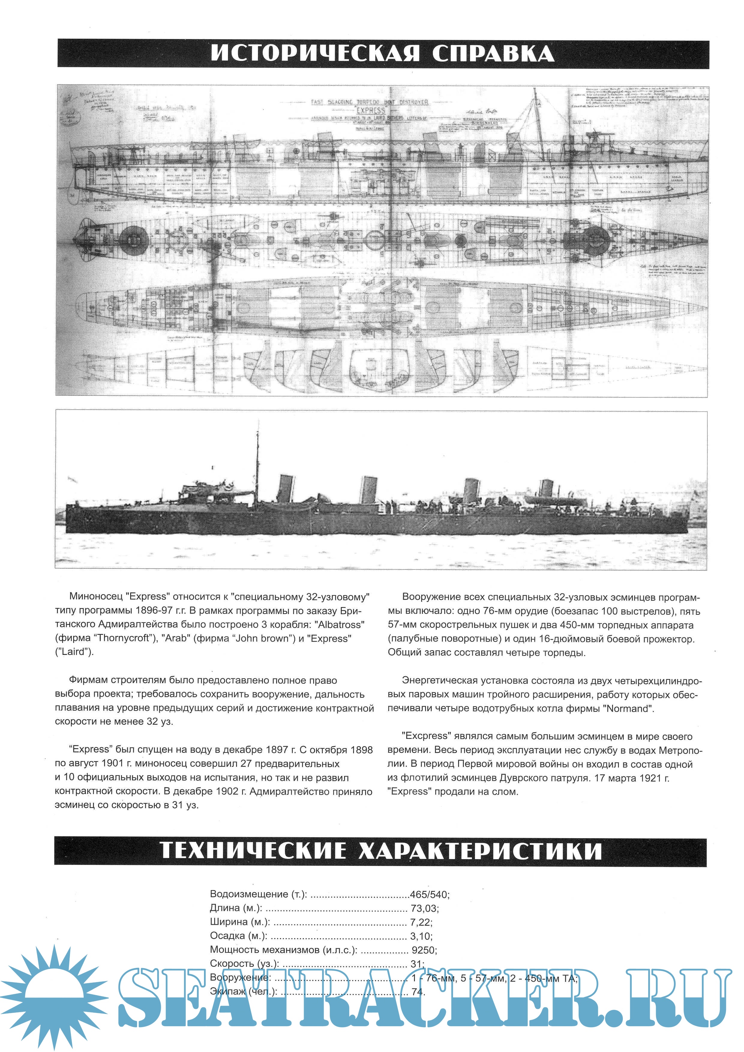 Описание: Миноносец "Express" относится к "специальному 32-узловому" типу программы 1896-97 гг. В рамках программы по заказу Британского Адмиралтейства было построено 3 корабля: "Albatross" (фирма "Thornycroft"), "Arab" (фирма "Jhon Brown") и "Express" ("Laird")