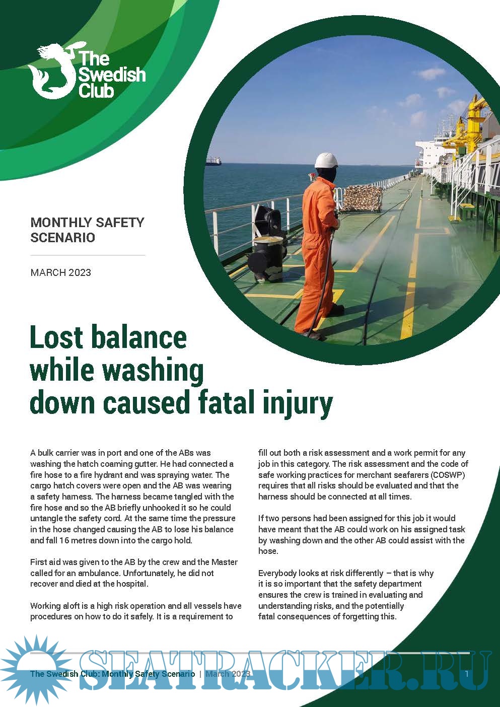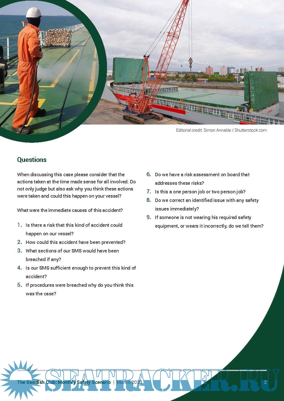 Year: 2023 Language: english Author: the Swedish Club Genre: Periodical (magazine) Format: PDF Quality: eBook Pages count: 3 Description: Under the ISM requirement, owners are obliged to carry out monthly safety meetings or safety committee meetings onboard their vessels. This obligation stems from Chapter 5 of the ISM Code: “Master’s responsibility and authority” and furthermore from “5.1.2, motivating the crew in the observation of that policy”. The Club is publishing, on a monthly basis, a new Monthly Safety Scenario (MSS) to assist owners in their efforts of complying with the above regulations. Alternative scenarios will be uploaded in SCOL. It is easy to download the MSS and enter the written conclusions from the meeting and send feedback to the shore-based organisation. Issue March, 2023