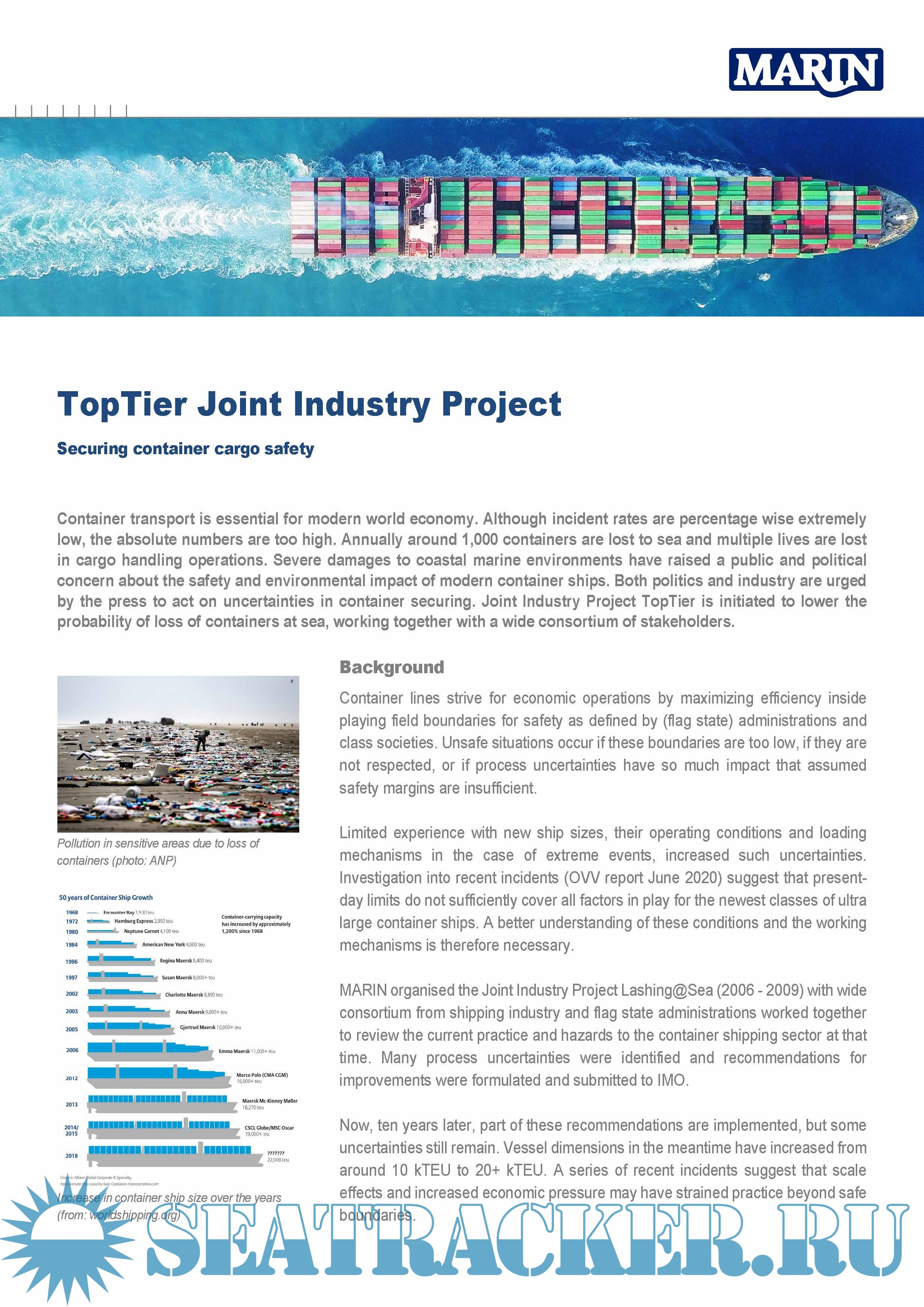 Description: The size of deep sea container ships has increased dramatically over the past decades. The loss of containers and their impact on the marine and coastal environments raised public and politic concerns on the safety and environmental impact of modern container ships. Authorities and industry are urged to evaluate container securing and improve regulations and practices to avoid such loss of containers at sea. The Joint Industry Project TopTier is initiated to address these topics with active participation of major stakeholders.