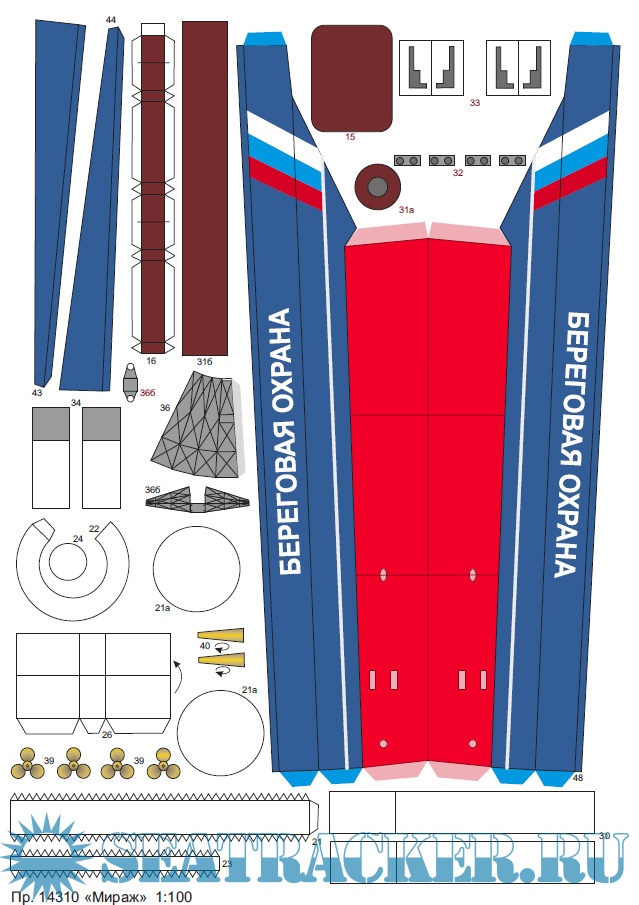 8 листов бумажных выкроек для изготовления бумажной модели патрульного катера проекта 14310 "Мираж" в масштабе 1:100