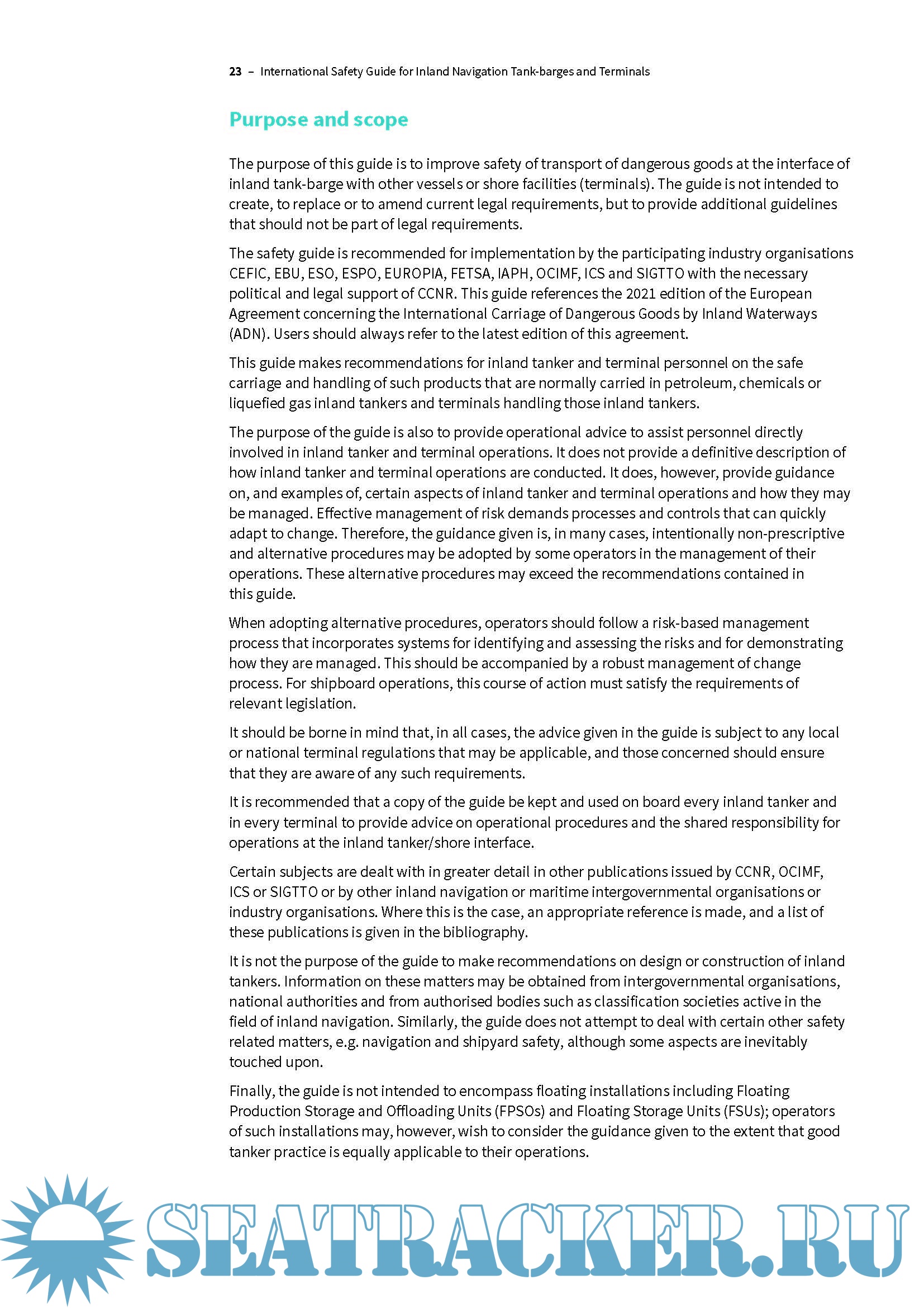 The purpose of this guide is to improve safety of transport of dangerous goods at the interface of inland tank-barge with other vessels or shore facilities (terminals). The guide is not intended to create, to replace or to amend current legal requirements, but to provide additional guidelines that should not be part of legal requirements.