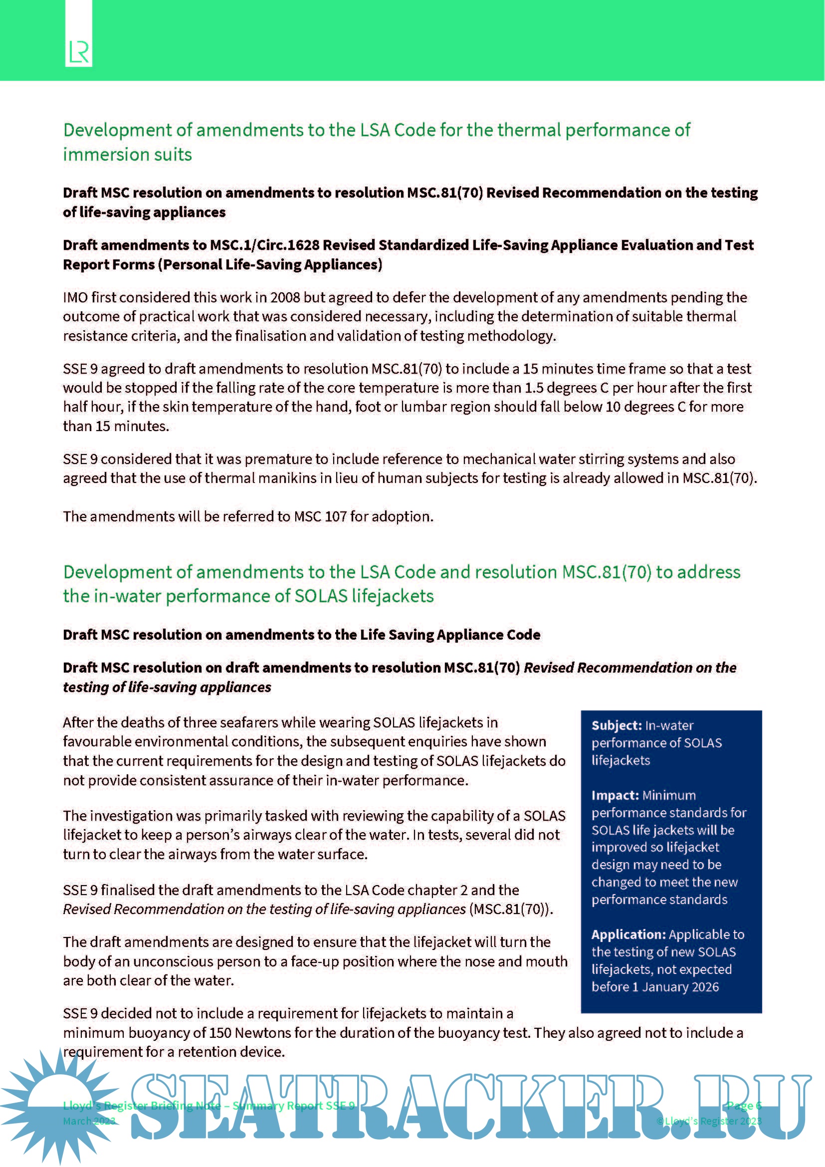 LR Summary Report for the IMO Ship Systems and Equipment Sub-Committee (SSE 8) - Lloyd's…