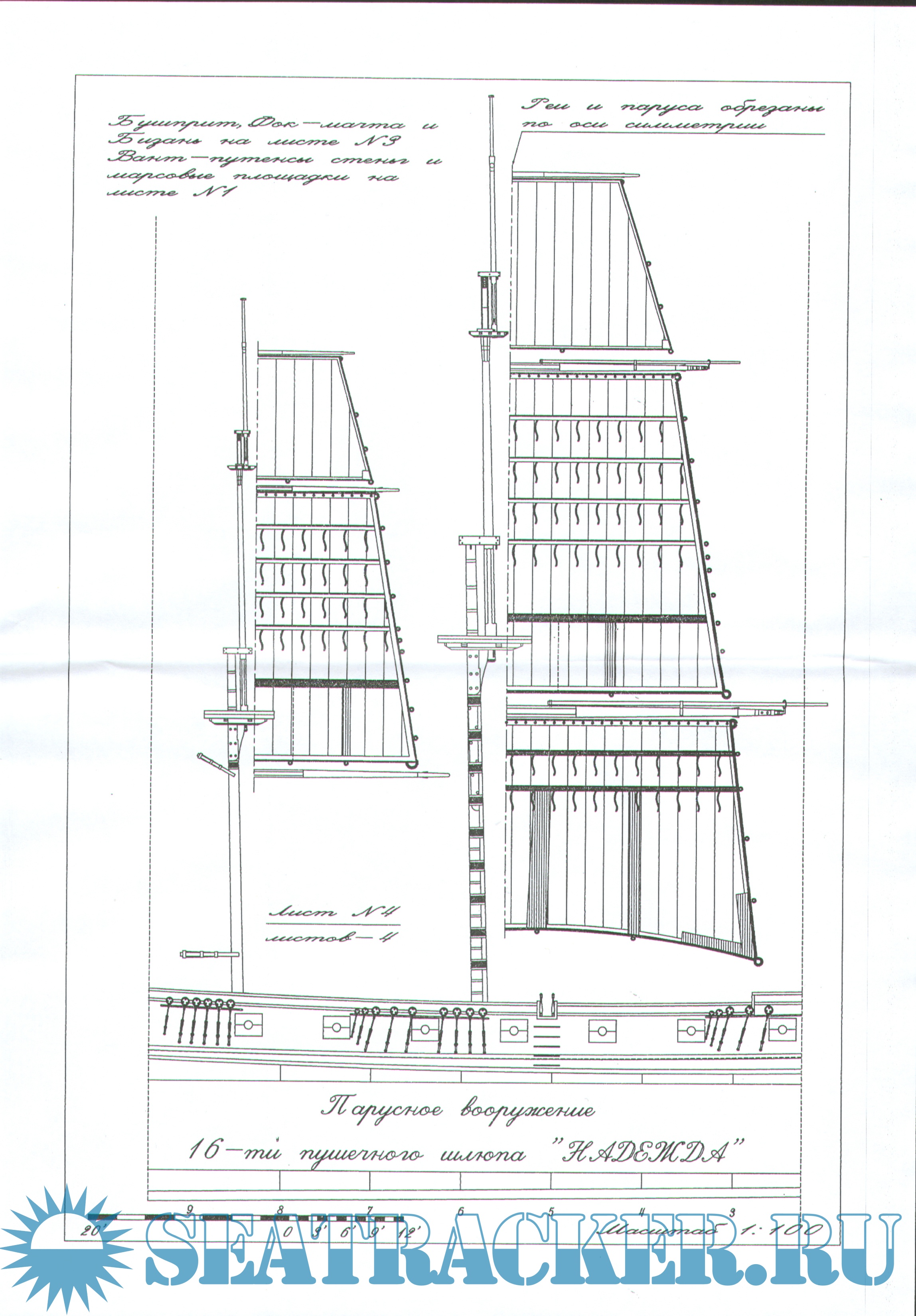 6 листов чертежей шлюпа "Надежда" в масштабе 1:100