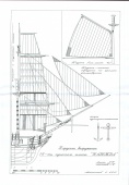 Исходя из этих данных, были изучены чертежи английских шлюпов подобных размерений конца 18, начала 19 веков, на основании которых был изготовлен предлагаемый чертеж. Надо отметить, что английская корабельная архитектура того времени несколько отличалась от принятой в России, да и класс кораблей - шлюп, для Русского флота не типичен.