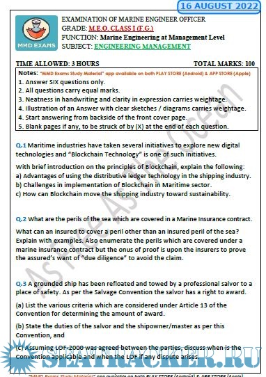 MMD Question Paper Set (March 2023) for M.E.O. Class II Examinations, India - D.G. Shipping, India…