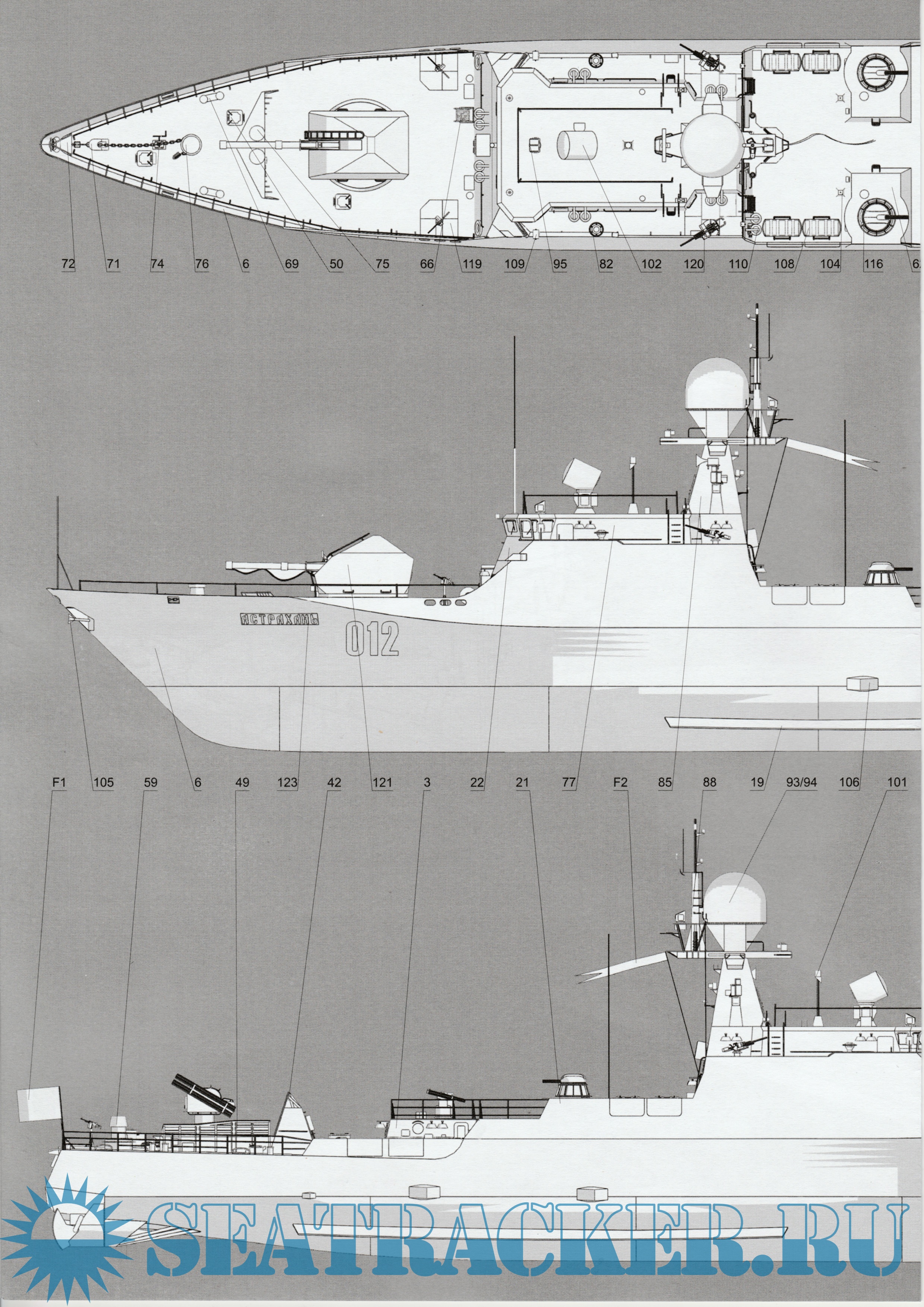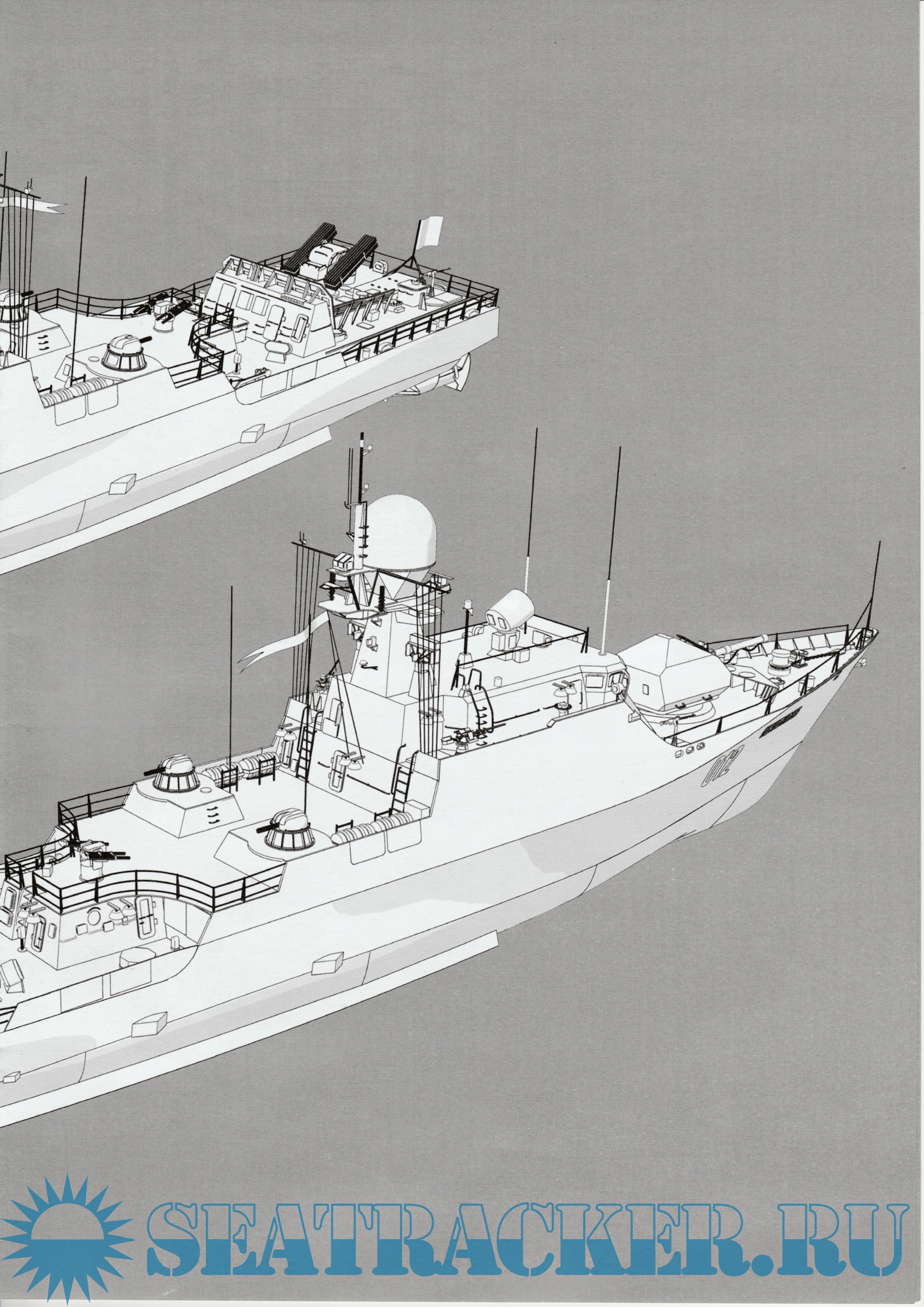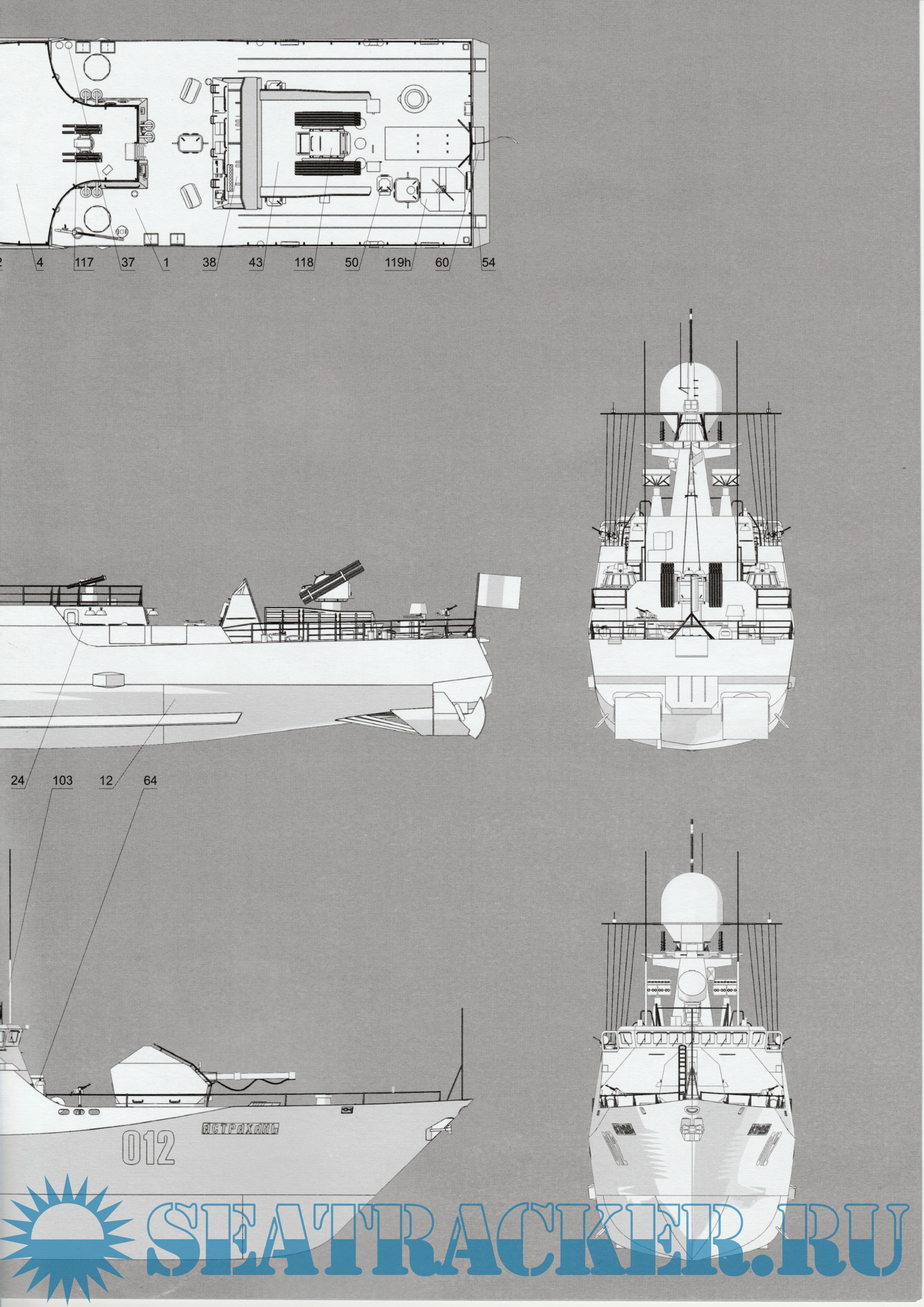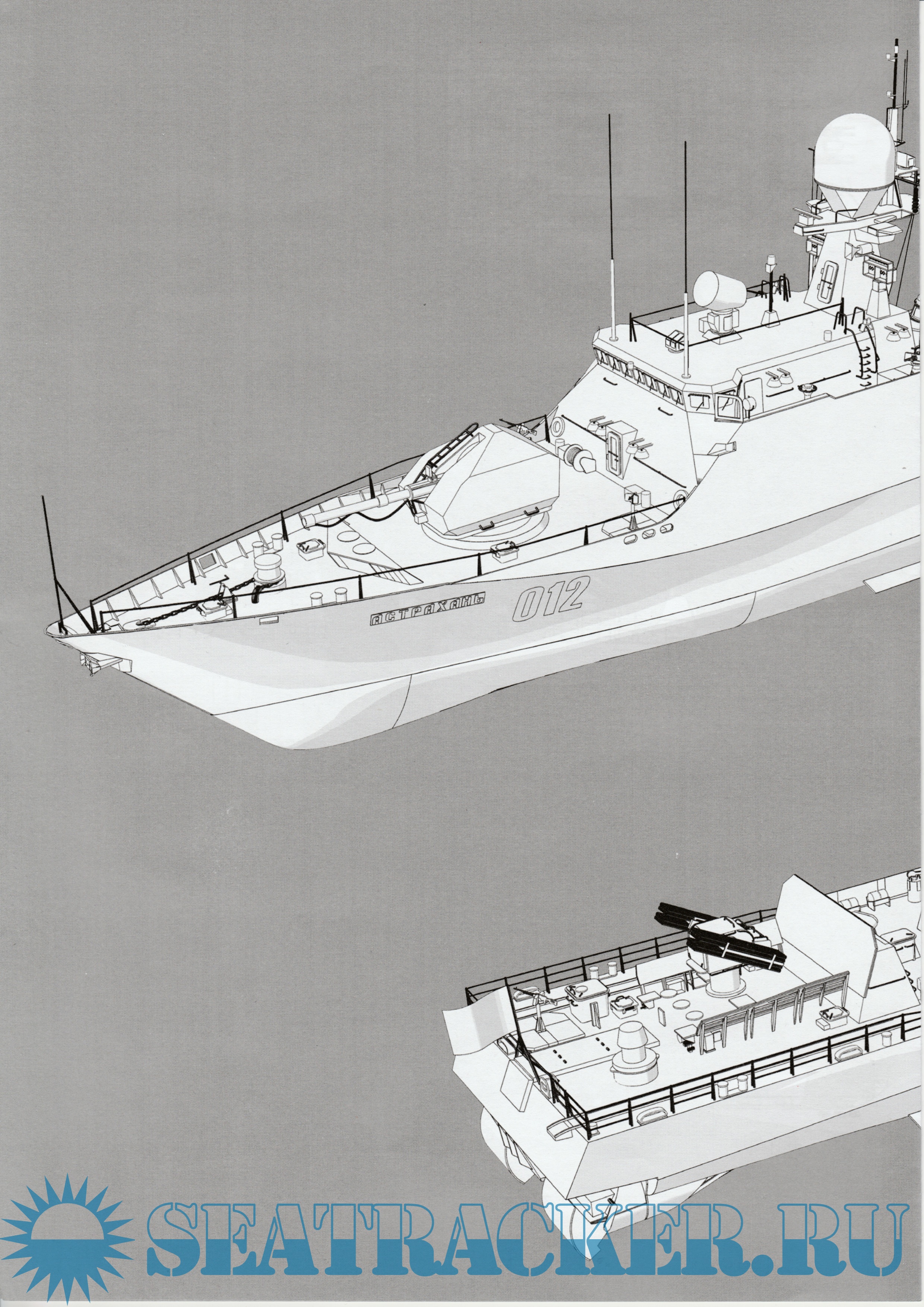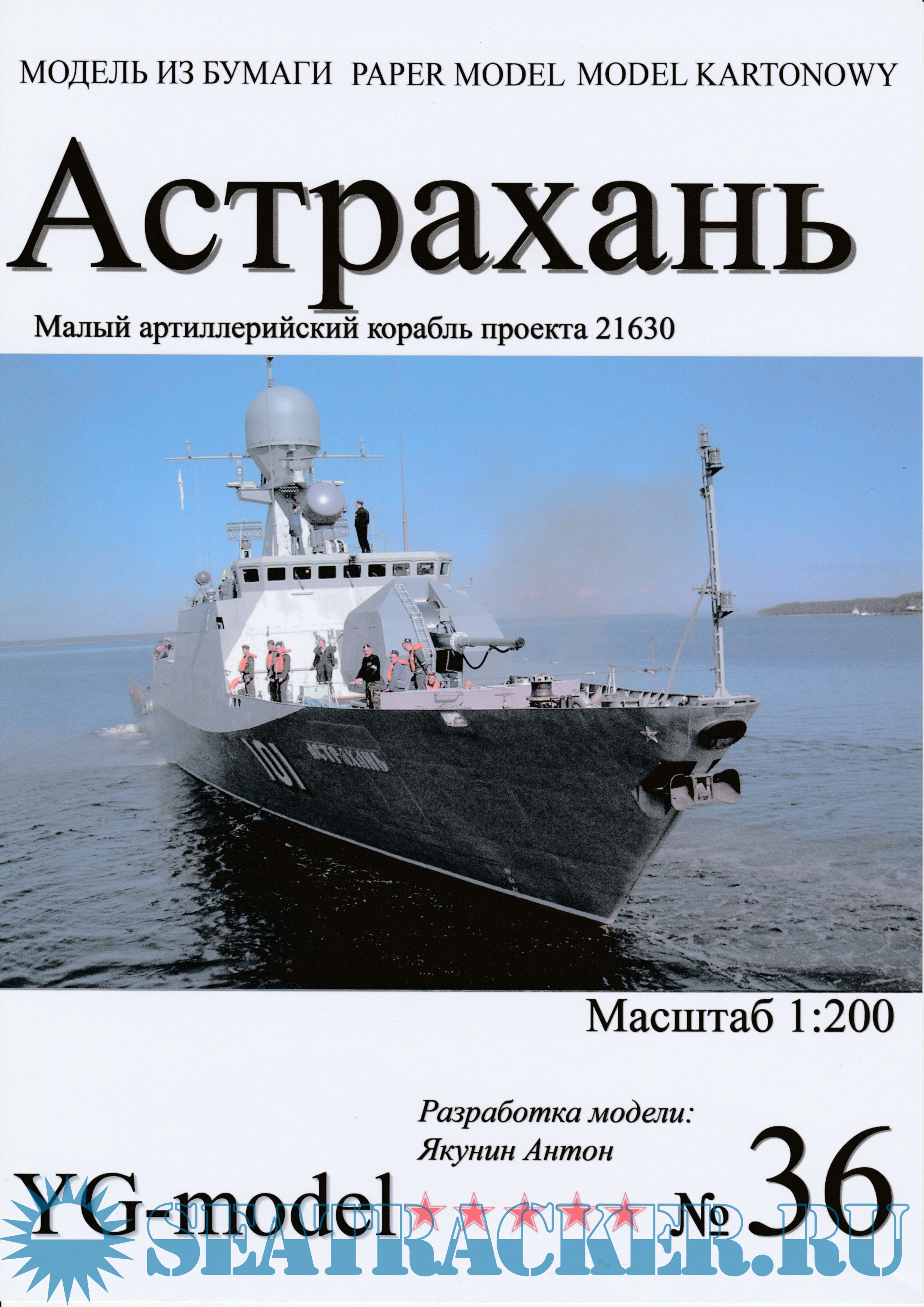 24 листа цветных выкроек и инструкций для изготовления бумажной модели малого артиллерийского корабля "Астрахань", проект 21630 в масштабе 1:200