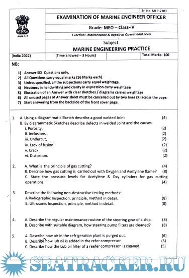 Question Paper for Marine Engineering Practice (M.E.P.) (updated July 2022) for M.E.O. Class IV…