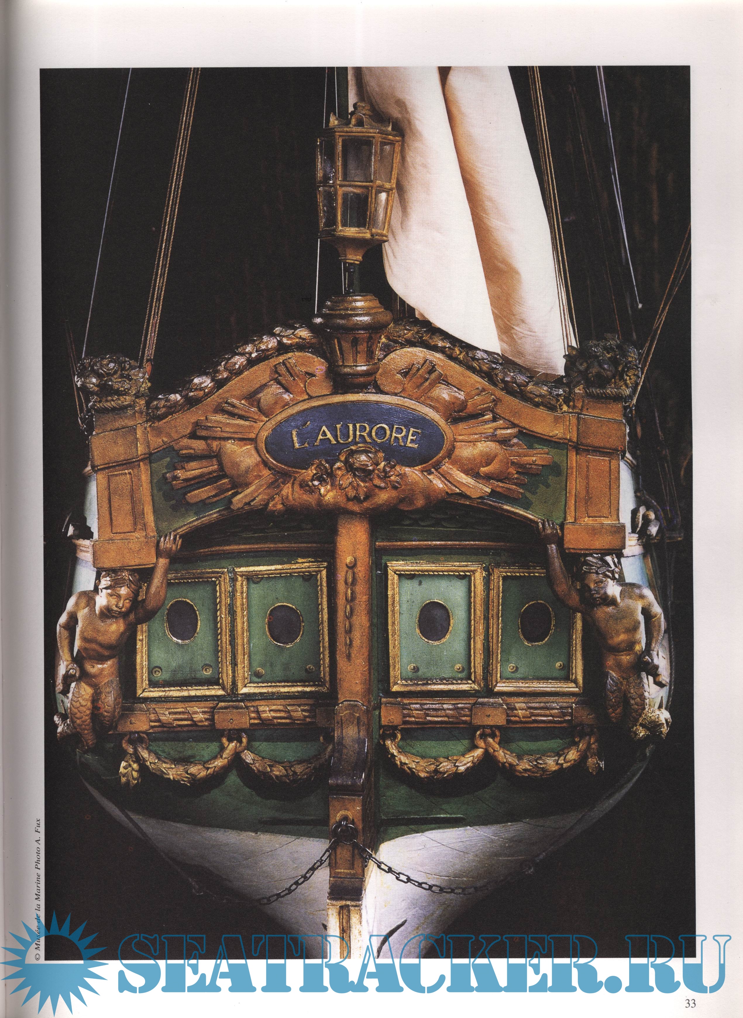 Enfin, pièce maîtresse, le modèle réalisé à l'issue de la croisière, conservé à la bibliothèque Ste Geneviève. Les modestes dimensions de L'Aurore ont permis d'adopter V échelle du 1/12'"". L'intérêt du modèle est exceptionnel car il s'agit d'une construction civile, si rare dans les collections, à fortiori pour cette époque. La grande échelle d'exécution permet de traiter des moindres détails, le réalisme est surprenant. Ajoutons que le modèle a été exécuté par des hommes de métier ayant participé au voyage, ceci lui donne une valeur d'authenticité absolue, cependant l'on peut regretter la disparition de quelques éléments (canots, artillerie). Les gens de pratique que sont les modélistes pourront apprécier de très nombreux détails, il y a beaucoup à apprendre et ceci grâce à une abondante illustration.