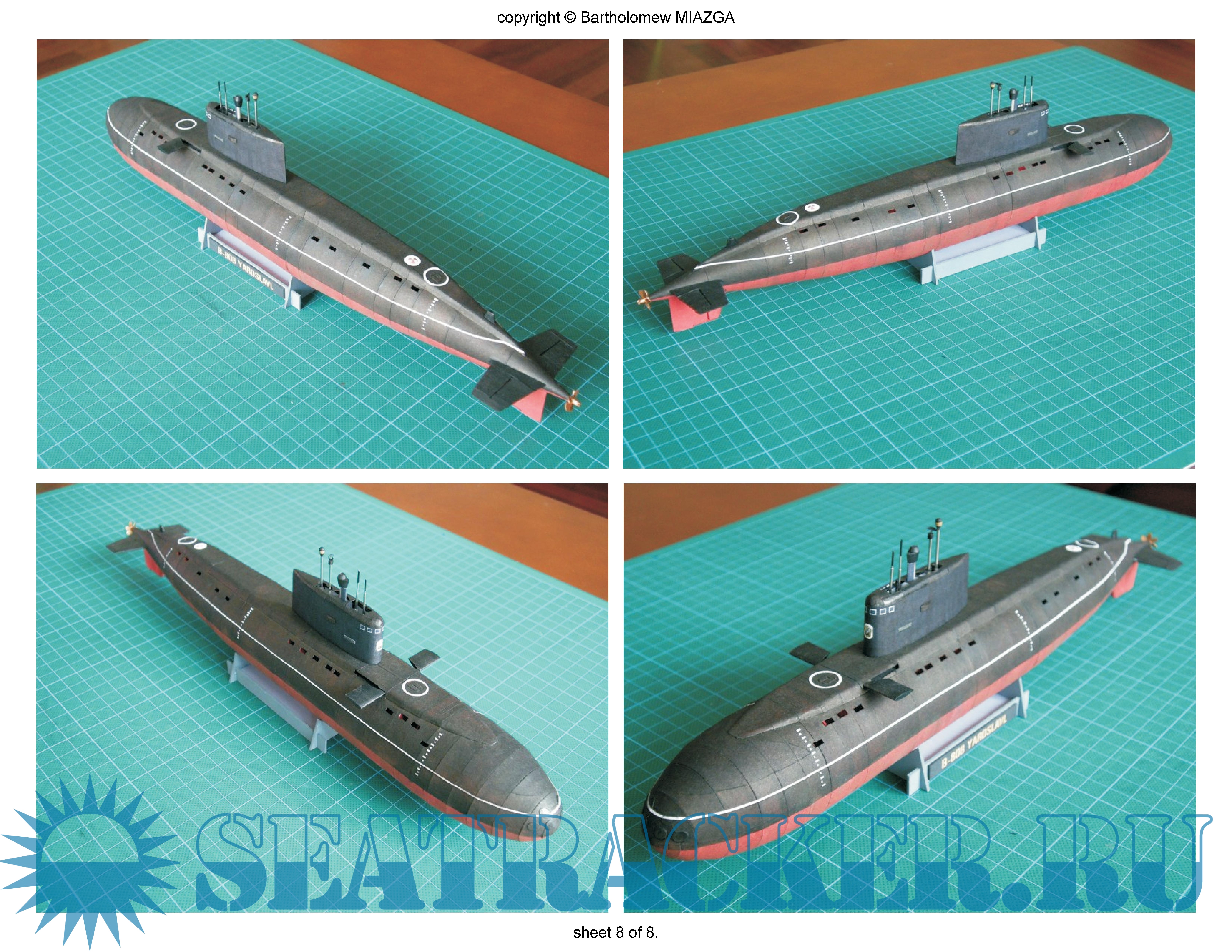 Описание: 22 листа цветных выкроек и инструкций для создания бумажной модели дизель-электрической подводной лодки "ЯРОСЛАВЛЬ" Б-808 проект 877 Варшавянка в масштабе 1:200