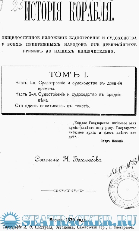 Год выпуска: 1879 Язык: русский Автор: Боголюбов Н. Жанр: История Формат: PDF Качество: Отсканированные страницы Количество страниц: 370 Описание: Общедоступное изложение судостроения и судоходства у всех прибрежных народов в древние времена и средневековье. \n\n?История корабля? написана русским писателем Николаем Петровичем Боголюбовым (1821-1898), бывшим моряком, старшим братом известного художника-мариниста Алексея Петровича Боголюбова. Главная цель автора - составить нечто вроде морской энциклопедии, в которой популярно и доступно для неподготовленного читателя излагается всеобщая история судостроения и судоходства. Издание содержит многочисленные рисунки в тексте. В первой части тома представлен исторический очерк древнейших прибрежных народов, у которых началось судостроение и судоходство:. Начало судостроения. - II. Судостроение у древних греков. - III. Рим. - IV. Тактика древних народов. - V. Северные народы. Во второй части, содержащей средневековую историю, на сцену морской деятельности выведены государства, образовавшиеся после распада Римской империи, подробно рассказано об их успехах в судостроении и мореплавании, об их соперничестве за морское превосходство, о использовавшихся военных и торговых судах:\nI. Мореплавание и судостроение в средние века. - II. Судостроение и судоходство в средние века. - III. Короткие суда. - IV. Тактика средневекового периода до введения огнестрельного оружия. - V. Артиллерия. - VI. Пираты. - VII. Суда антиевропейские