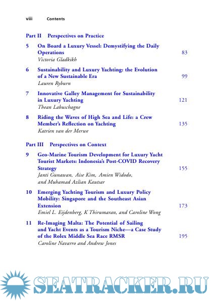 Part I offers a range of academic contributions on luxury yachting from a tourism perspective. Part II provides an insight into the industry from the practitioner perspective. Part III stimulates discussions around yachting practices in different destinations.