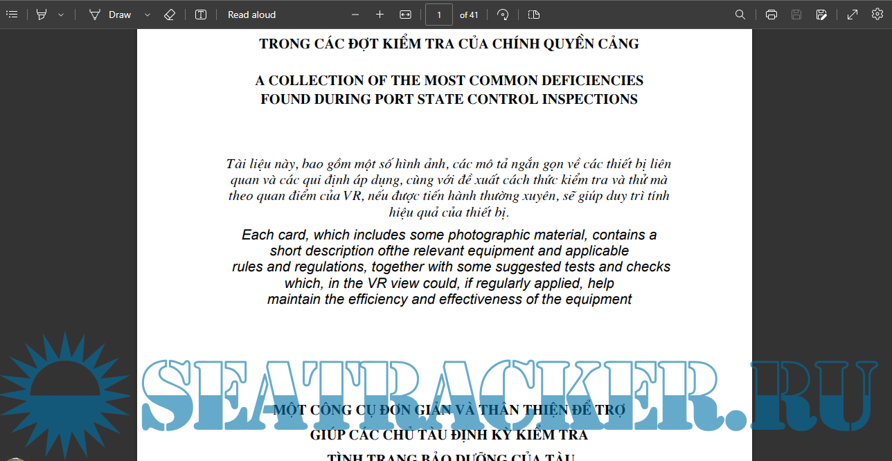 Year: 2004 Language: english Author: HoangNam Genre: Reference book Format: PDF Quality: eBook Pages count: 41 Description: A COLLECTION OF THE MOST COMMON DEFICIENCIES FOUND DURING PORT STATE CONTROL INSPECTIONS. Each card, which includes some photographic material, contains a short description ofthe relevant equipment and applicable rules and regulations, together with some suggested tests and checks which, in the VR view could, if regularly applied, help maintain the efficiency and effectiveness of the equipment