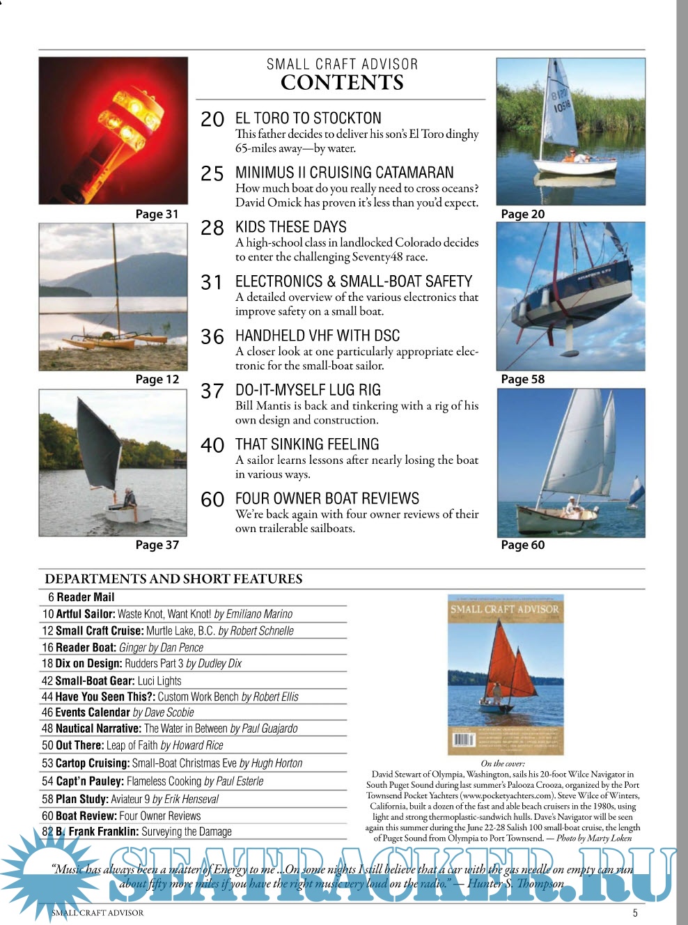 Description: Small boats, big adventure! The only magazine focused on small and trailerable sailboats, cruising, and adventure. Each issue features places to sail, how-to and modification articles, a plan study for the boat builder, and a feature-length review of a production sailboat.