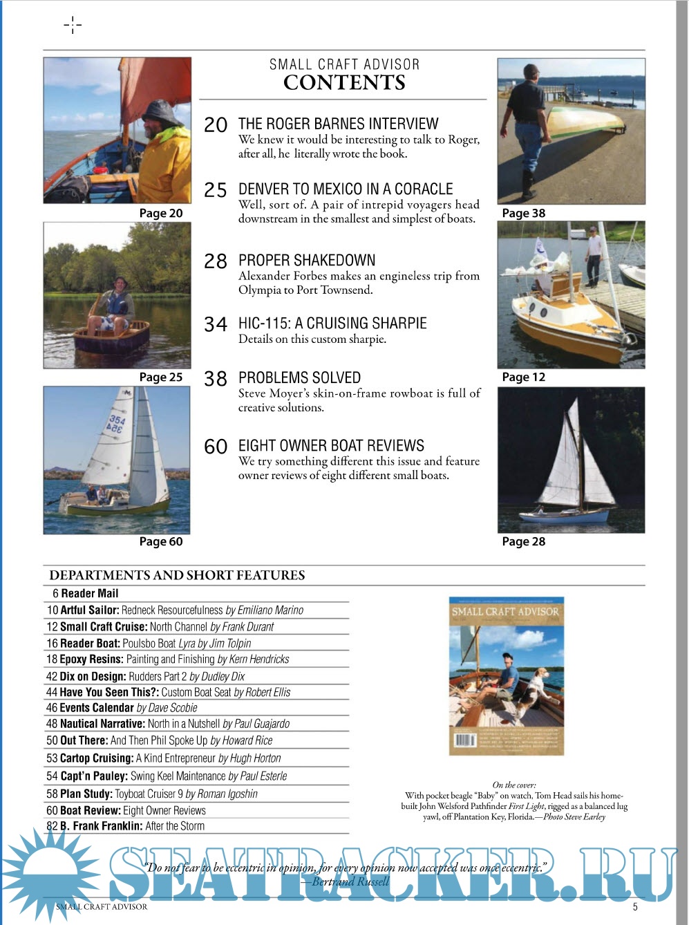 Description: Small boats, big adventure! The only magazine focused on small and trailerable sailboats, cruising, and adventure. Each issue features places to sail, how-to and modification articles, a plan study for the boat builder, and a feature-length review of a production sailboat.