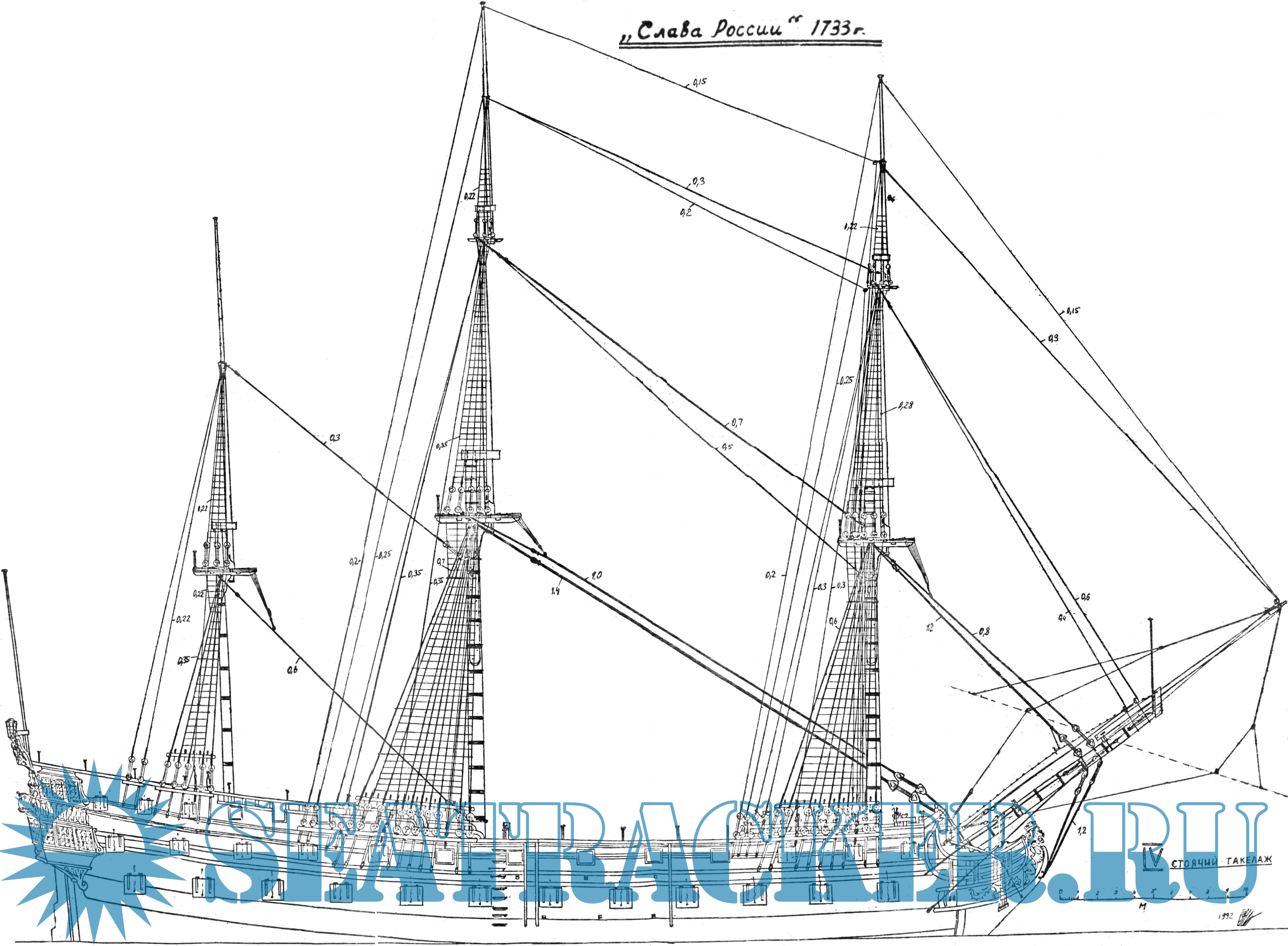 Описание: 15 листов чертежей 66-пушечного линейного корабля "Слава России" 1733 год