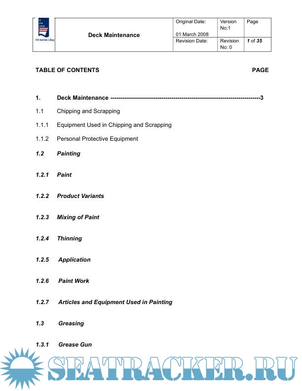 Year: 2008 Language: english Author: NYK Maritime College Genre: Manual Publisher: NYK Maritime College Format: PDF/DOC Quality: eBook Pages count: 35 Description: Maintenance is the continuous protective care of the fabric, contents and setting of a place. A maintenance plan is the most cost-effective way to ensure the ongoing value of any asset, particularly a ship. The plan should include regular inspections, prompt attention to repairs and a cleaning program.
