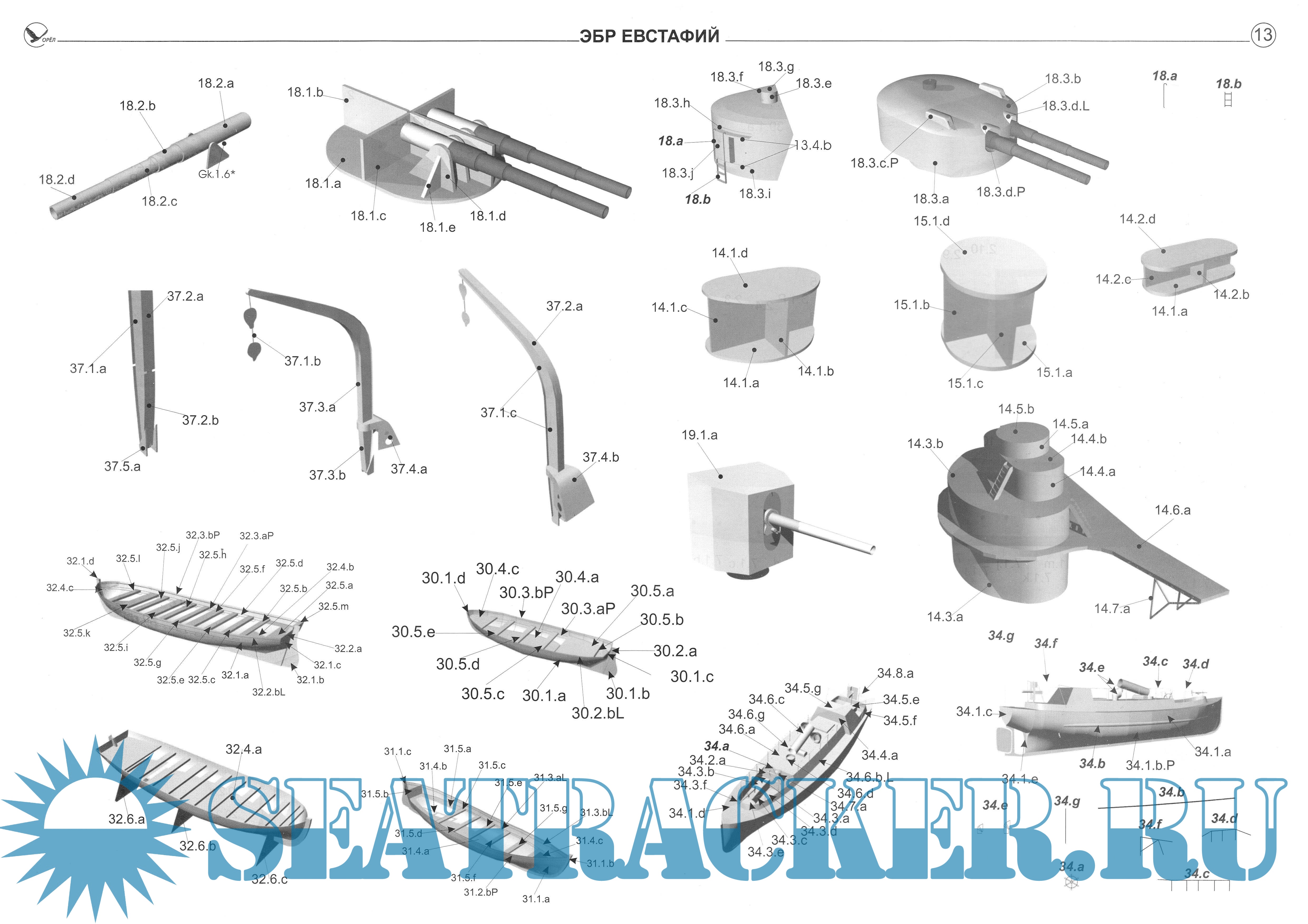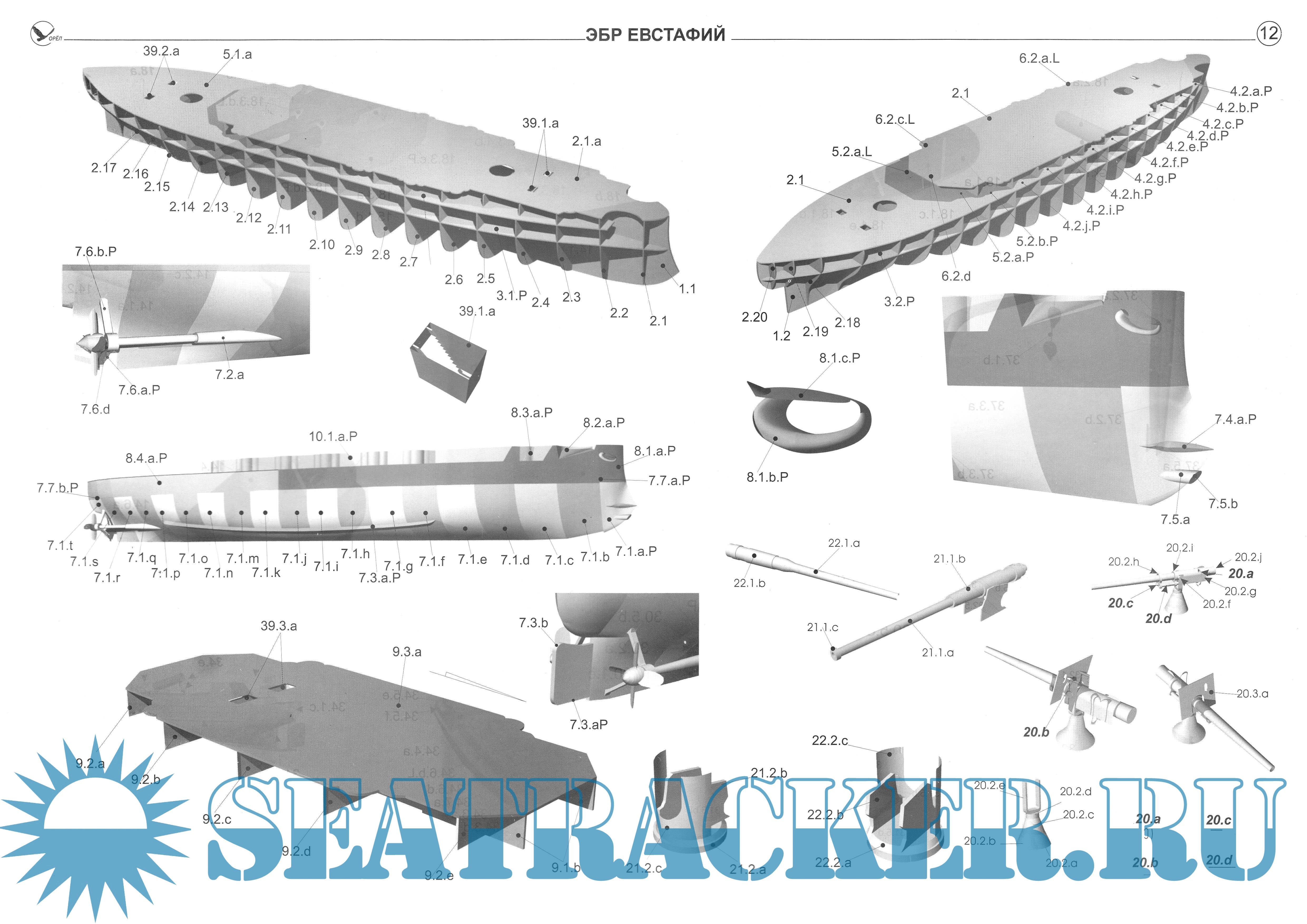 Описание: 19 листов цветных выкроек и инструкций для изготовления бумажной модели в масштабе 1:200 линейного корабля "Евстафий" по состоянию на 1911 год
