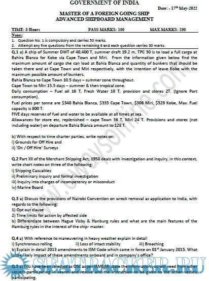 Question Paper Set for (ASM) Advanced Shipboard Management (April 2023) for Master's Examinations, Mercantile Marine Department (MMD), India