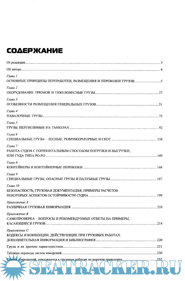 Описание: В книге подробно описаны принципы размещения, крепления и перевозки грузов, виды грузовых устройств, особенности перевозки различных грузов на судах. Особое внимание уделено безопасности при перевозках различных грузов, контролю остойчивости судна при погрузочно-разгрузочных операциях, ведению судовой документации.Предназначена для судовладельцев, работников судоходных компаний, капитанов судов и их помощников, а также для курсантов (студентов) высших и средних мореходных училищ, институтов, академий Министерства транспорта и Комитета по рыболовству РФ.