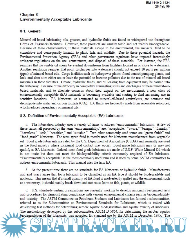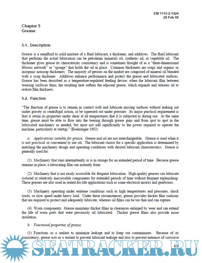 Description: This manual is intended to be a practical guide to lubrication with enough technical detail to allow personnel to recognize and easily discern differences in performance properties specified in manufacturers’ product literature so that the proper lubricant for a particular application is selected. It describes basic characteristic properties of oils, hydraulic fluids, greases, solid lubricants, environmentally acceptable lubricants, and their additives. It examines the mechanics of hydrodynamic, boundary, extreme pressure, and elastohydrodynamic lubrication to protect against surface deterioration. Separate chapters are devoted to lubricant specification and selection, and requirements of lubricants for equipment currently in use at USACE civil works facilities. Because conscientious adherence to lubrication schedules is the best prescription for longevity of component parts, operation and maintenance considerations are also addressed.