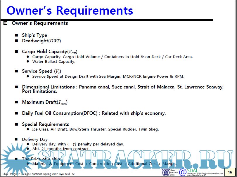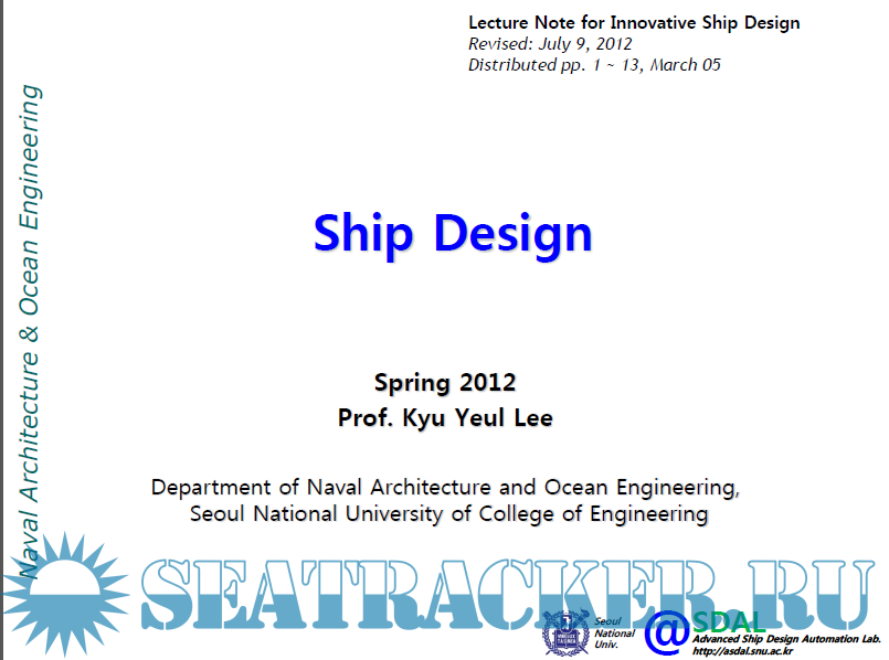 Description: 1) Procedures and methods of the basic ship design process are introduced: Determination of ship’s principal dimensions, Estimation of weight, stimation of cargo hold volume, Calculation of freeboard, Prediction of resistance, speed and power, Determination of propeller principal dimensions, Selection of main engine, Hull form design by hull form variation method, General arrangement design, Naval architectural calculation such as volume, hydrostatics, trim & stability, subdivision & damage stability(SDS), longitudinal strength, Midship section structural design, Grillage analysis for Hull Structure.