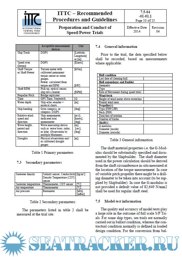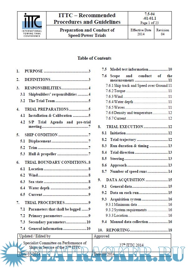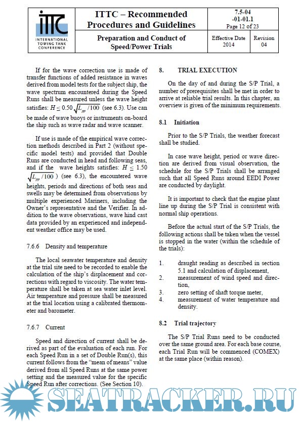 Year: 2014 Language: english Author: International Tank Towing Conference Genre: Guide Format: PDF Quality: Scanned pages + text layer Pages count: 23 Description: The primary purpose of speed-power trials is to determine ship performance in terms of speed, power and propeller revolutions under pre-scribed ship conditions, and thereby verifying the satisfactory attainment of the contractually stipulated Ship Speed and to provide the Ship Speed for the calculation of the Energy Effi-ciency Design Index (EEDI) as required by IMO. The present Recommended Procedure con-cerns the preparation and execution of speed-power trials and has been defined by the 27th ITTC Specialist Committee on the Performance of Ships in Service.