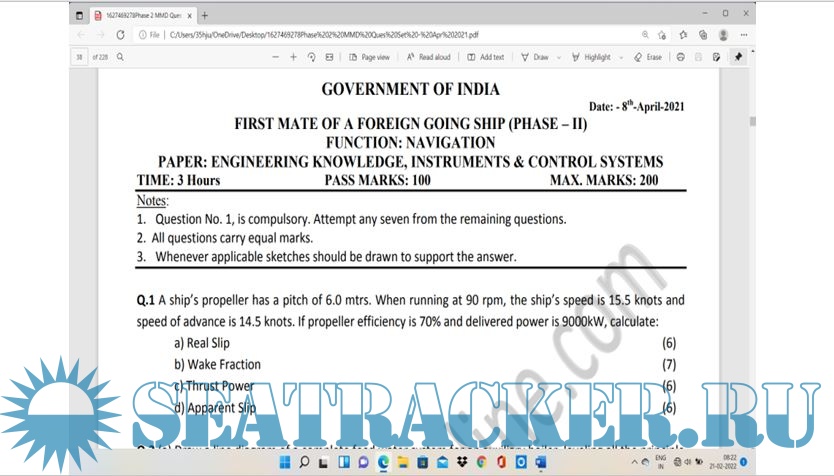 Solved Numericals (2021) from Past Question Papers of Mercantile Marine Department (MMD), India Examinations for Phase II (Chief Mate F.G.).